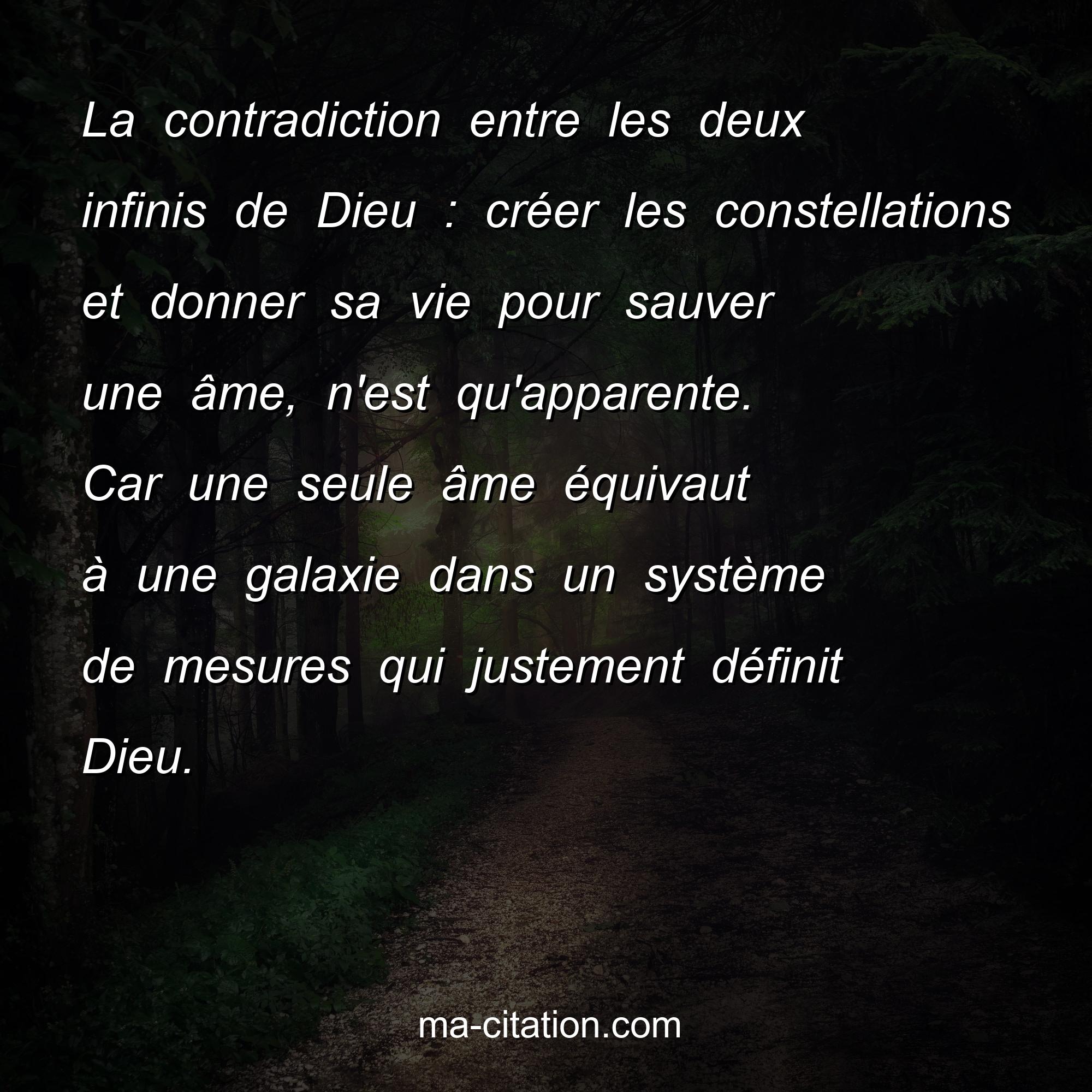 La contradiction entre les deux infinis de Dieu : créer les constellations et donner sa vie pour sauver une âme, n'est qu'apparente. Car une seule âme équivaut à une galaxie dans un système de mesures qui justement définit Dieu.