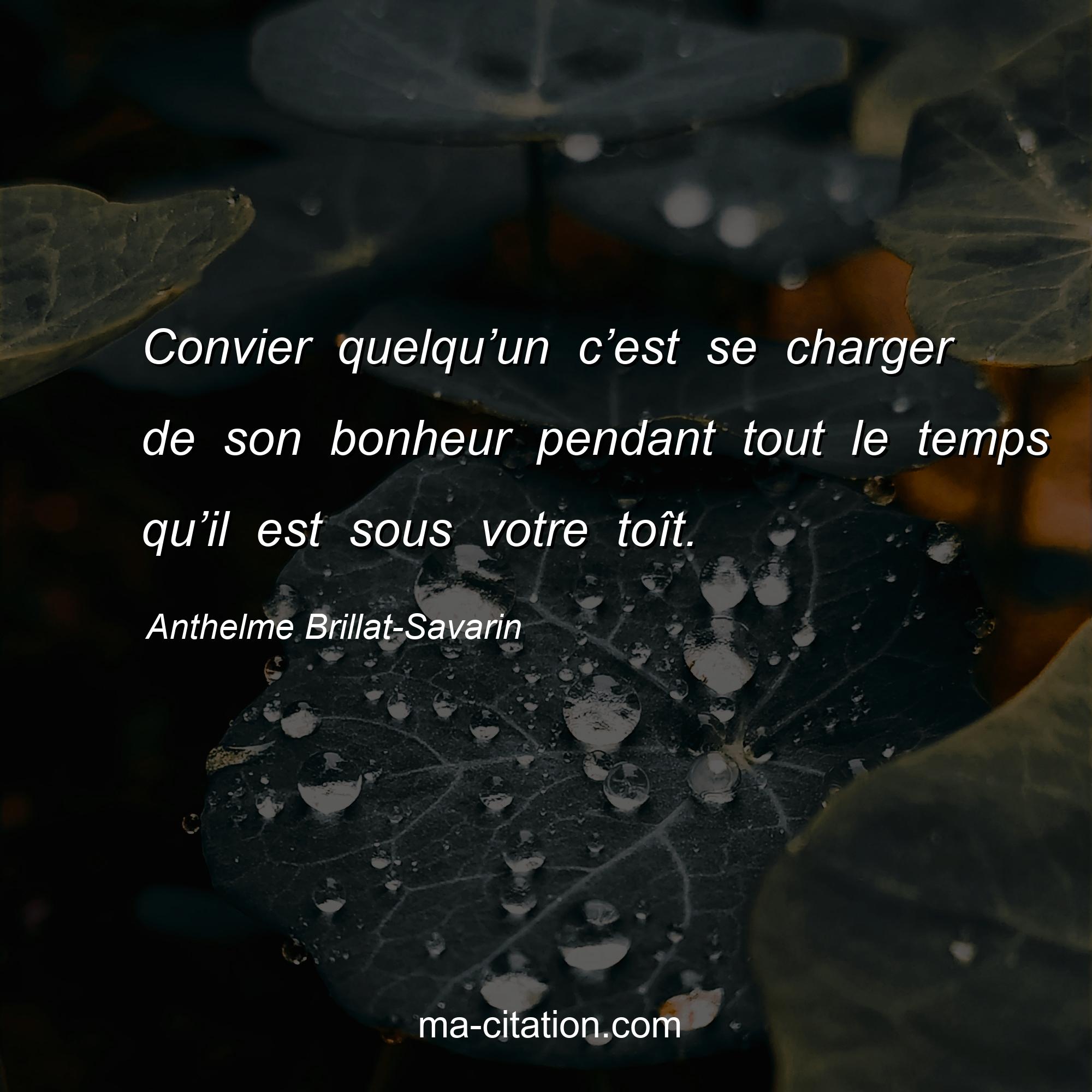 Citation sur la vie d'Anthelme Brillat-Savarin :Convier quelqu’un c’est se charger de son bonheur pendant tout le temps qu’il est sous votre toît.