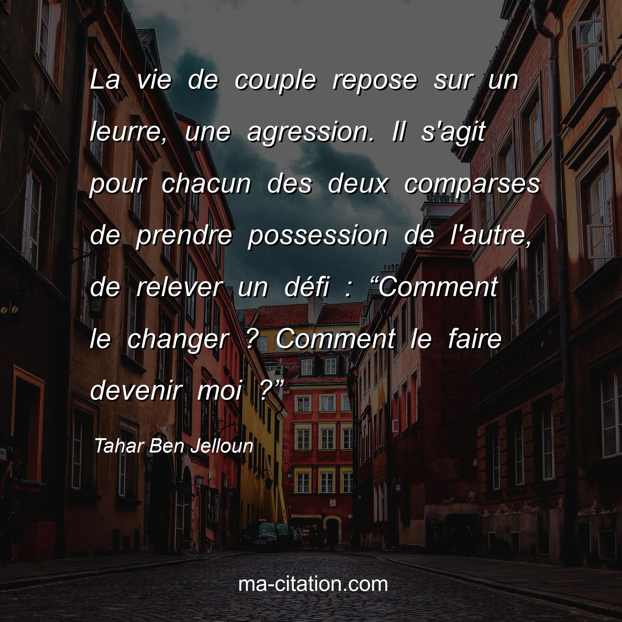 Tahar Ben Jelloun est l'auteur de la citation sur la vie "La vie de couple repose sur un leurre, une agression. Il s'agit pour chacun des deux comparses de prendre possession de l'autre, de relever un défi : “Comment le changer ? Comment le faire devenir moi ?â€".