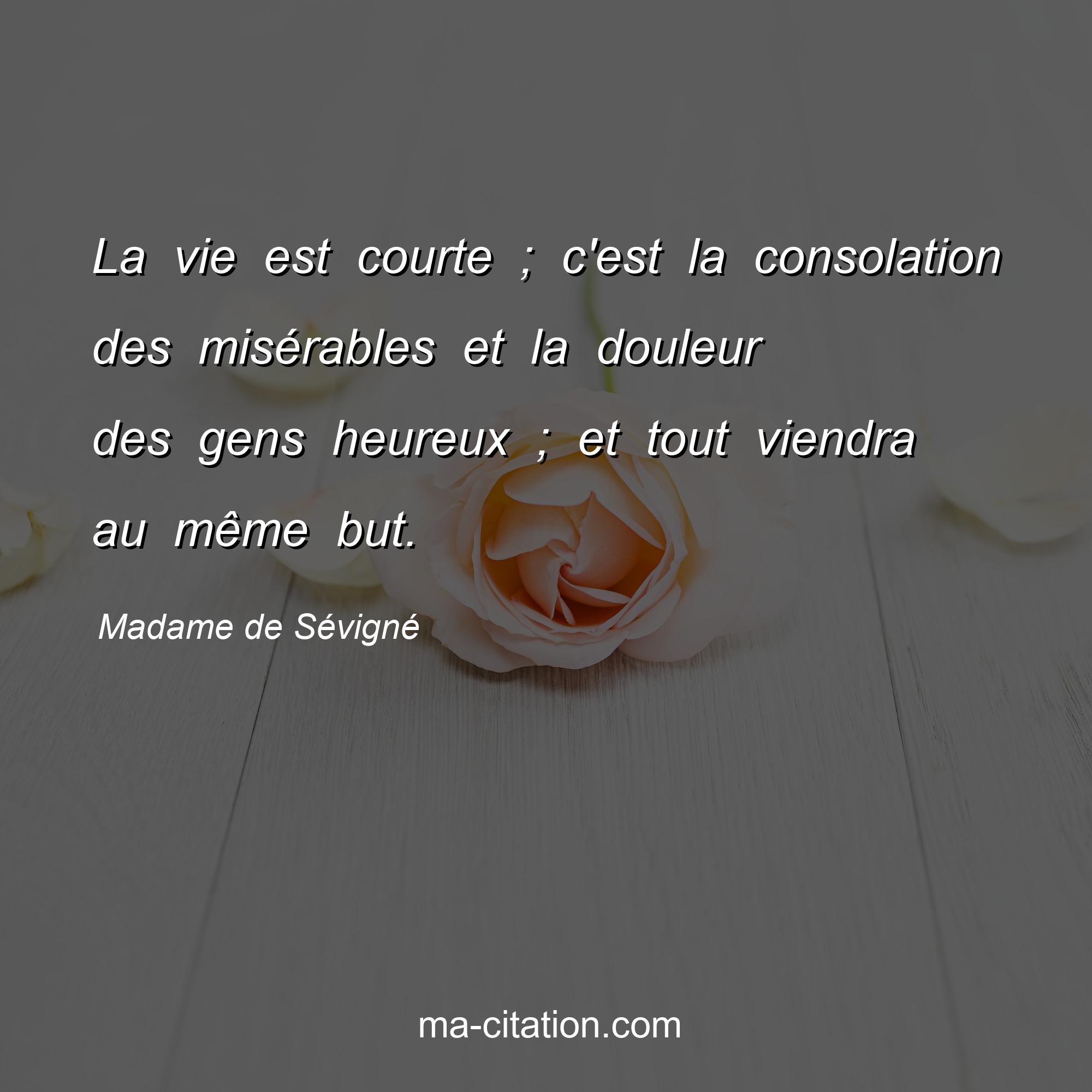 Citation sur la vie de Madame de Sévigné :La vie est courte ; c'est la consolation des misérables et la douleur des gens heureux ; et tout viendra au même but.