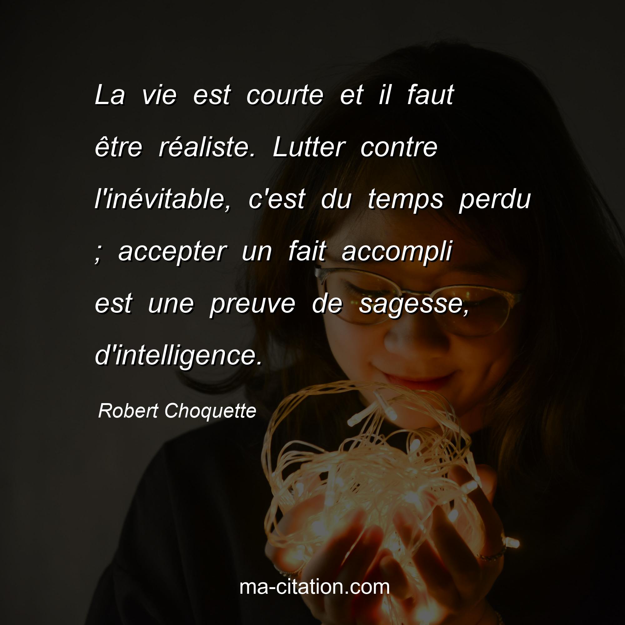 Citation sur la vie de Robert Choquette :La vie est courte et il faut être réaliste. Lutter contre l'inévitable, c'est du temps perdu ; accepter un fait accompli est une preuve de sagesse, d'intelligence.