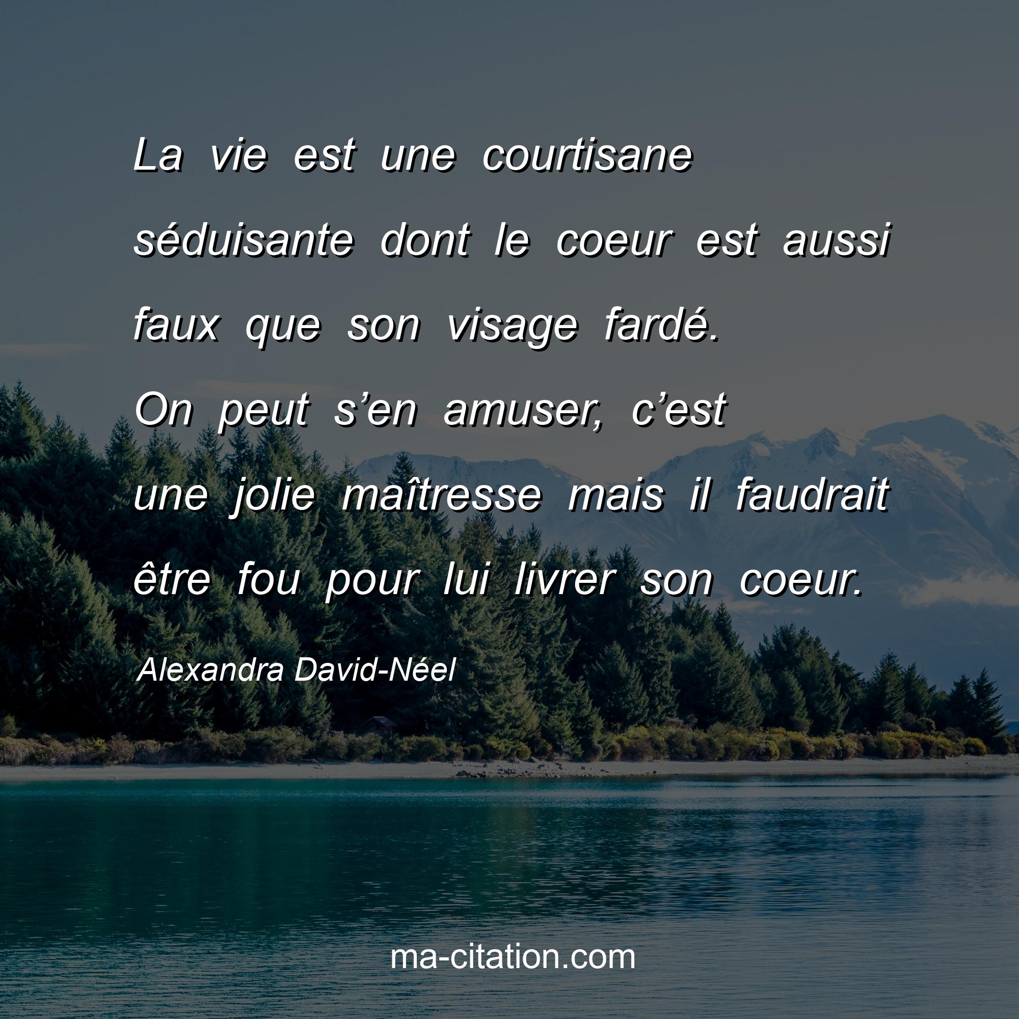 Citation sur la vie d'Alexandra David-Néel :La vie est une courtisane séduisante dont le coeur est aussi faux que son visage fardé. On peut s’en amuser, c’est une jolie maîtresse mais il faudrait être fou pour lui livrer son coeur.