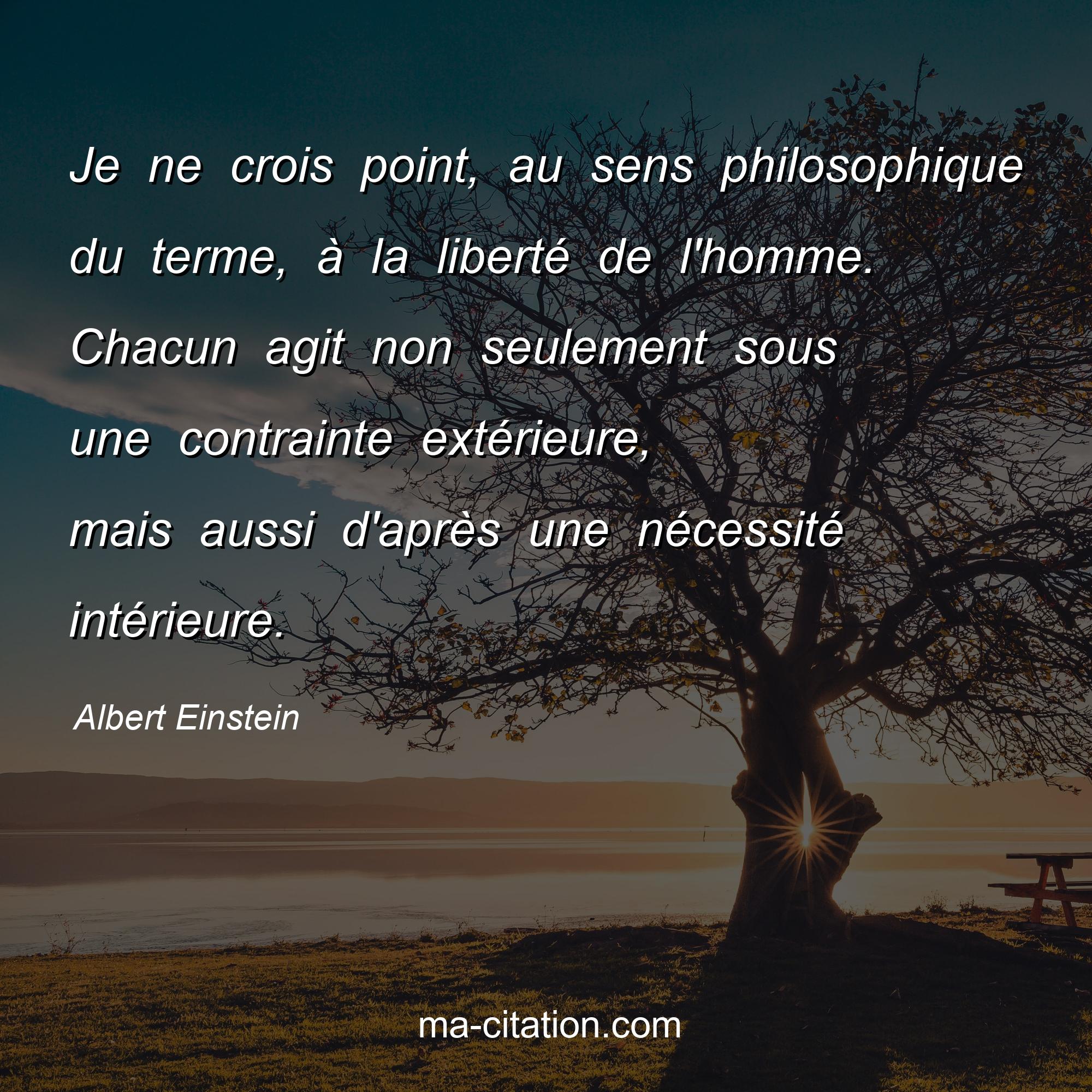 Citation sur la vie d'Albert Einstein :Je ne crois point, au sens philosophique du terme, à la liberté de l'homme. Chacun agit non seulement sous une contrainte extérieure, mais aussi d'après une nécessité intérieure.
