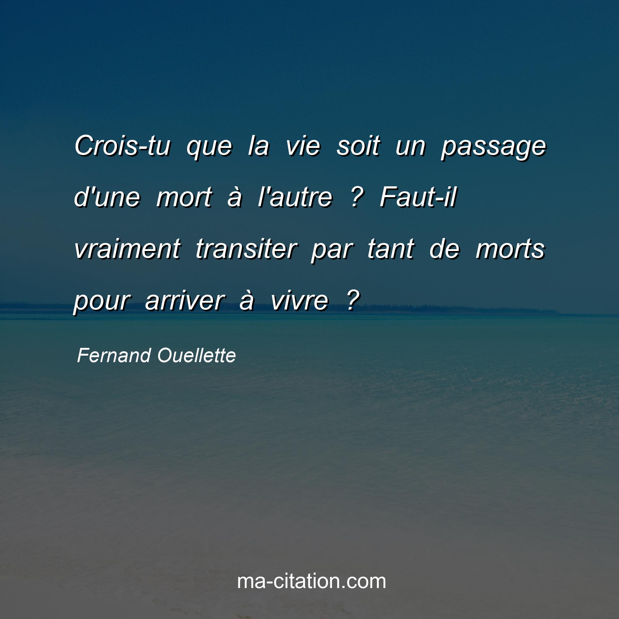 Fernand Ouellette est l'auteur de la citation sur la vie "Crois-tu que la vie soit un passage d'une mort à l'autre ? Faut-il vraiment transiter par tant de morts pour arriver à vivre ?".
