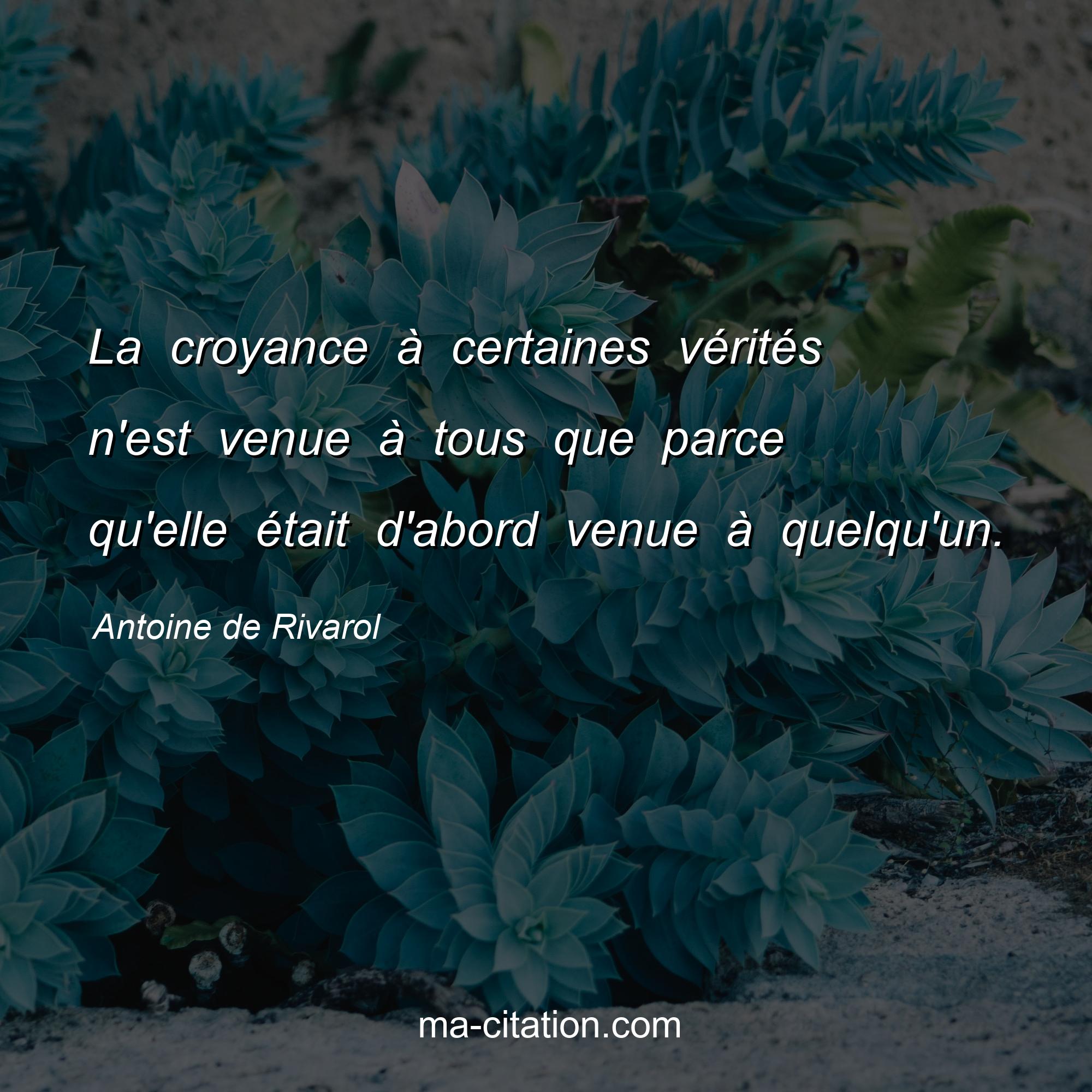 Citation sur la vie d'Antoine de Rivarol :La croyance à certaines vérités n'est venue à tous que parce qu'elle était d'abord venue à quelqu'un.