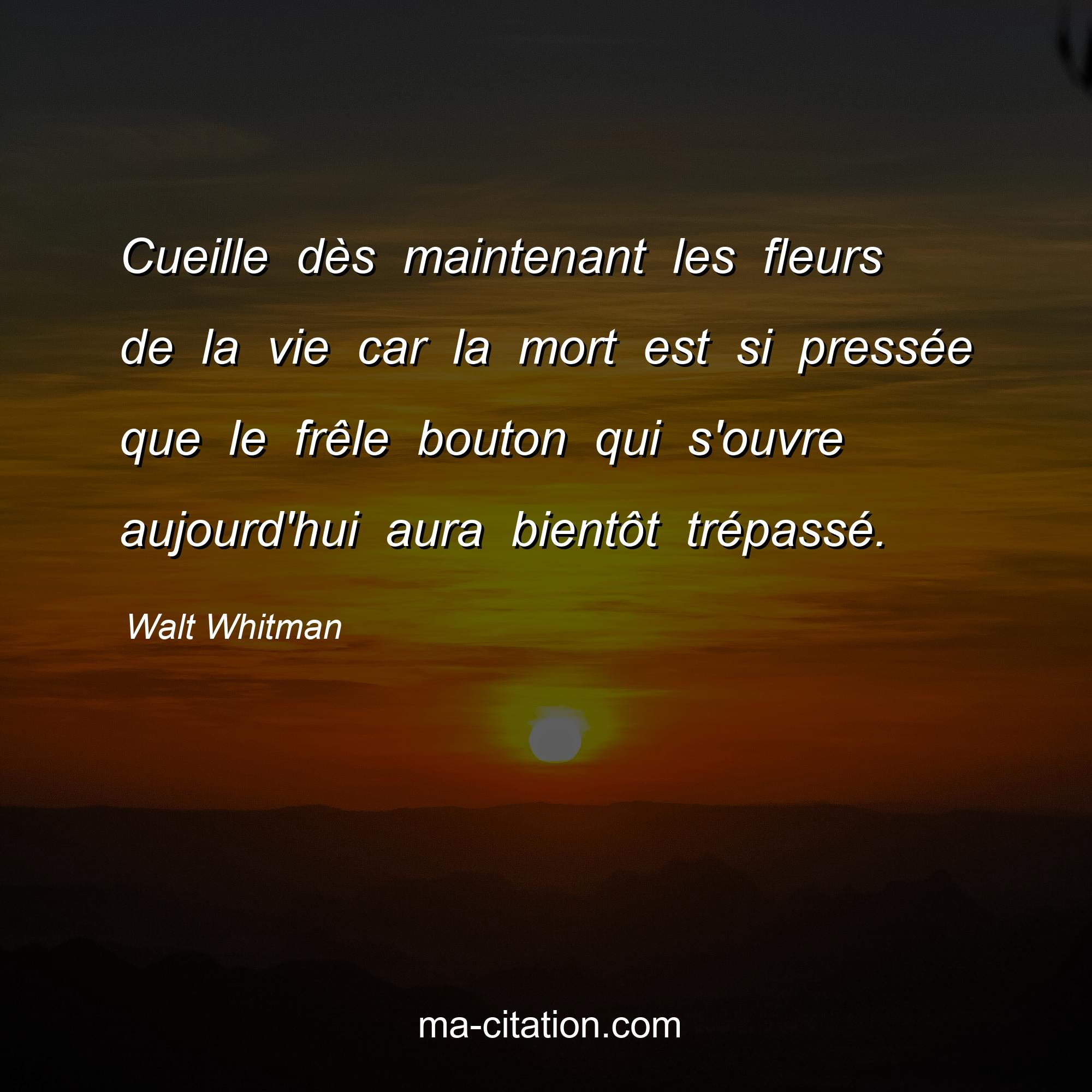 Citation sur la vie de Walt Whitman :Cueille dès maintenant les fleurs de la vie car la mort est si pressée que le frêle bouton qui s'ouvre aujourd'hui aura bientôt trépassé.