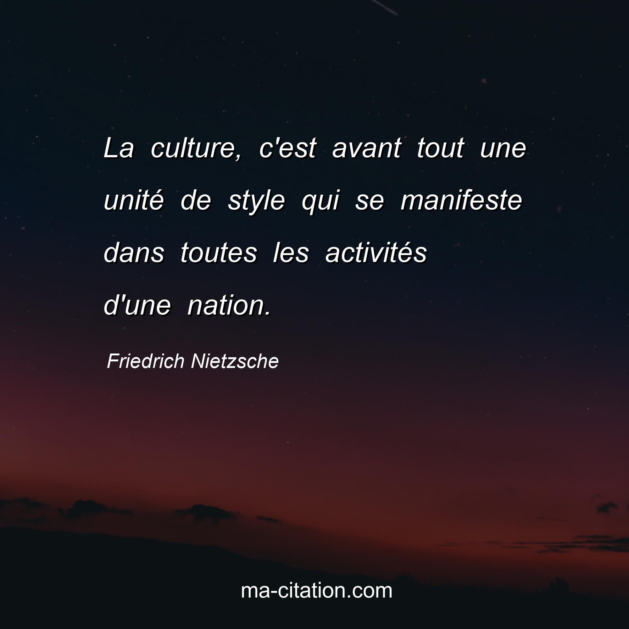 Citation sur la vie de Friedrich Nietzsche :La culture, c'est avant tout une unité de style qui se manifeste dans toutes les activités d'une nation.