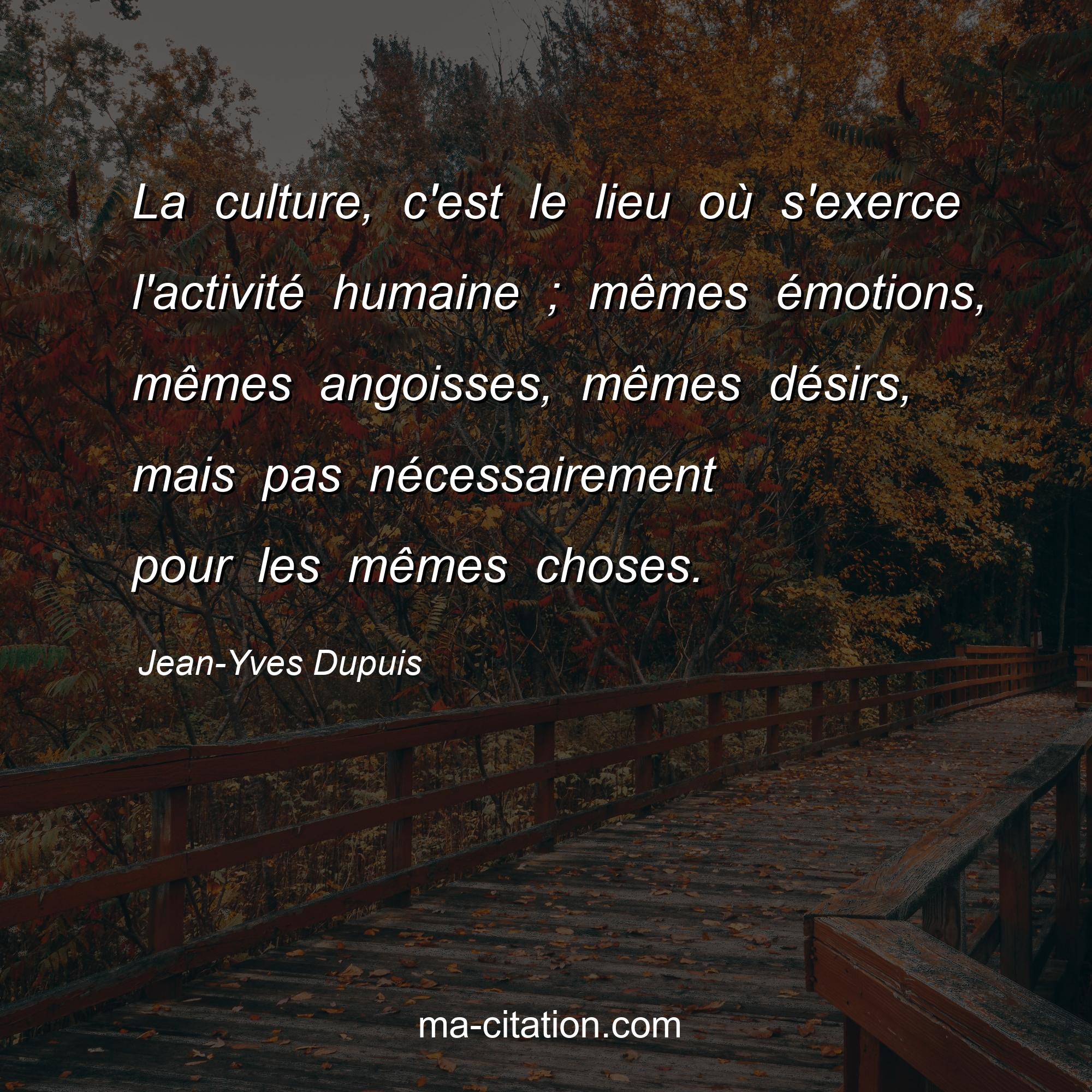 Citation sur la vie de Jean-Yves Dupuis :La culture, c'est le lieu où s'exerce l'activité humaine ; mêmes émotions, mêmes angoisses, mêmes désirs, mais pas nécessairement pour les mêmes choses.