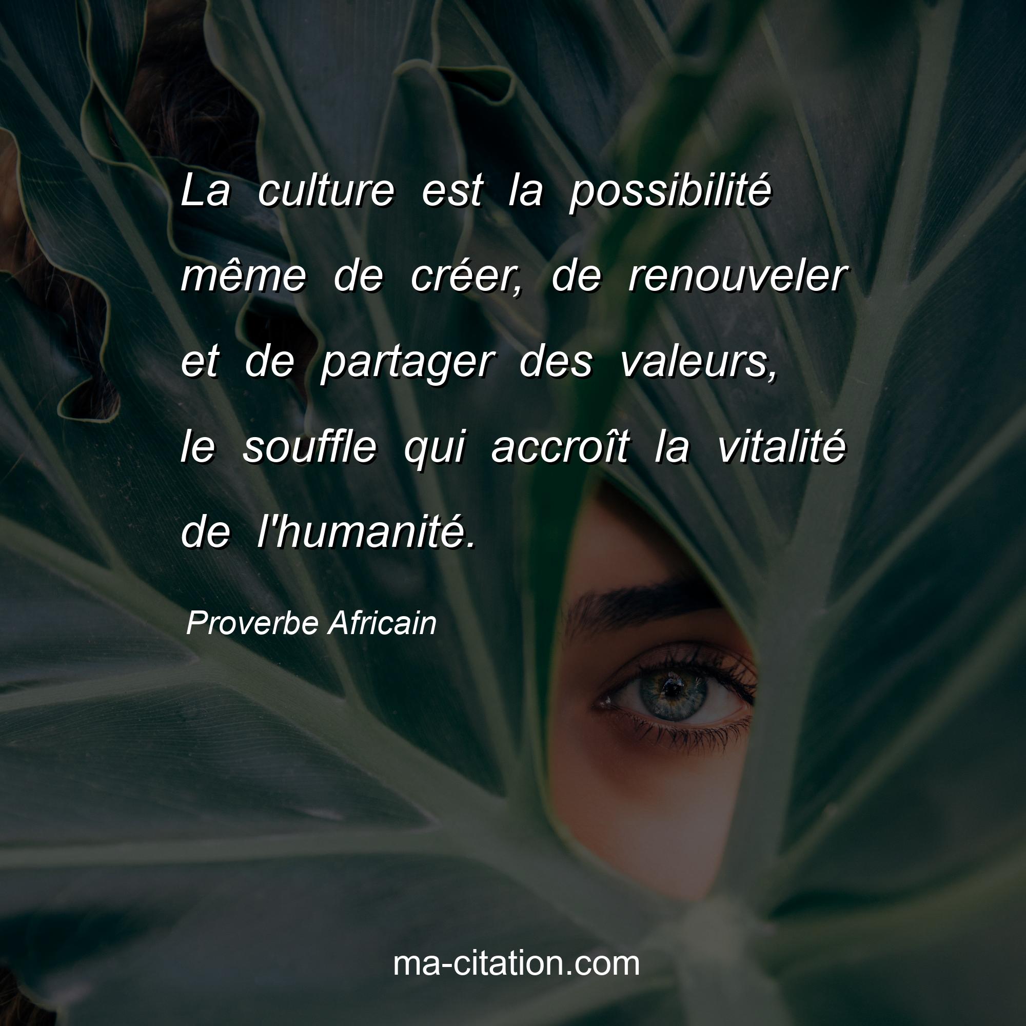Proverbe Africain sur la vie :La culture est la possibilité même de créer, de renouveler et de partager des valeurs, le souffle qui accroît la vitalité de l'humanité.