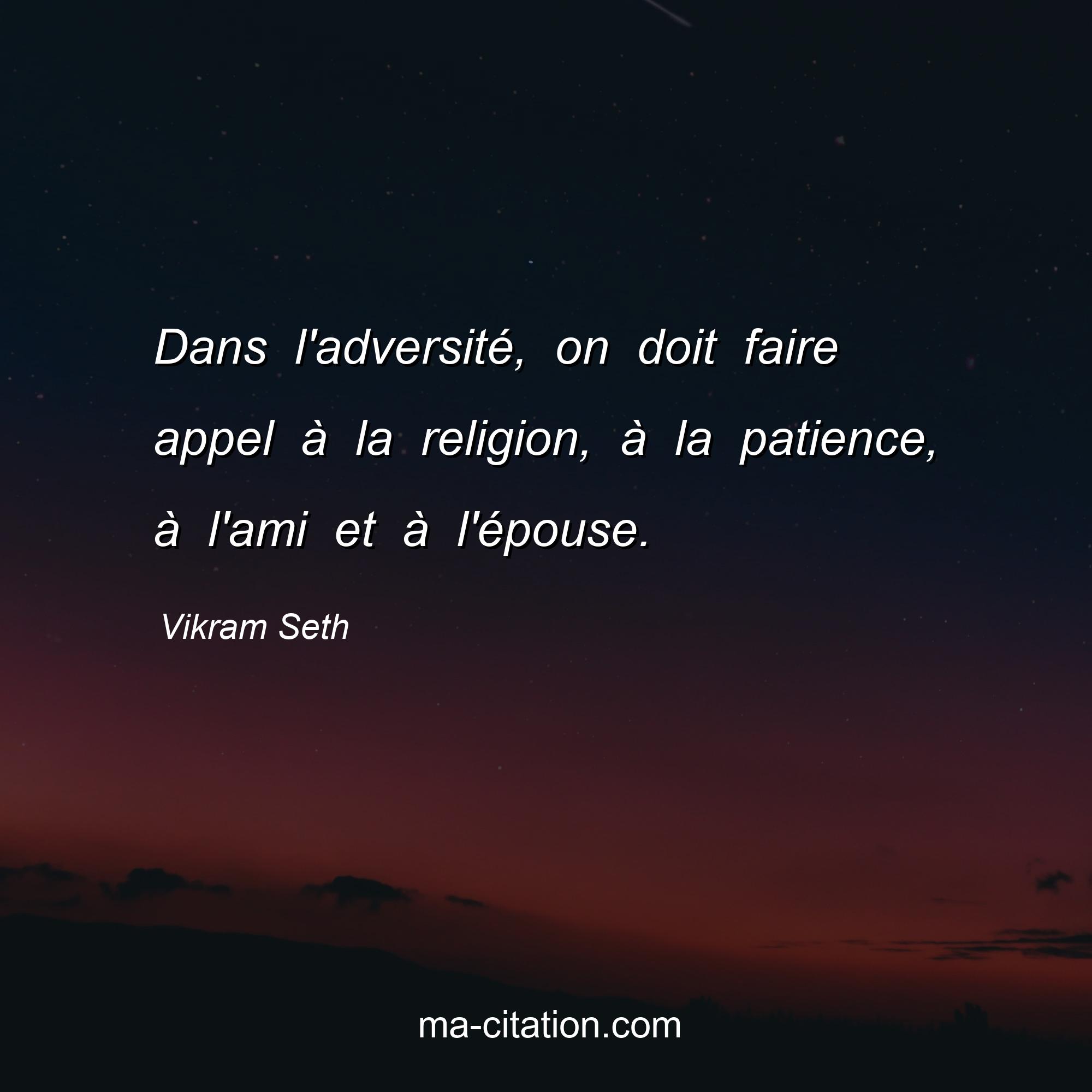 Citation sur la vie de Vikram Seth :Dans l'adversité, on doit faire appel à la religion, à la patience, à l'ami et à l'épouse.