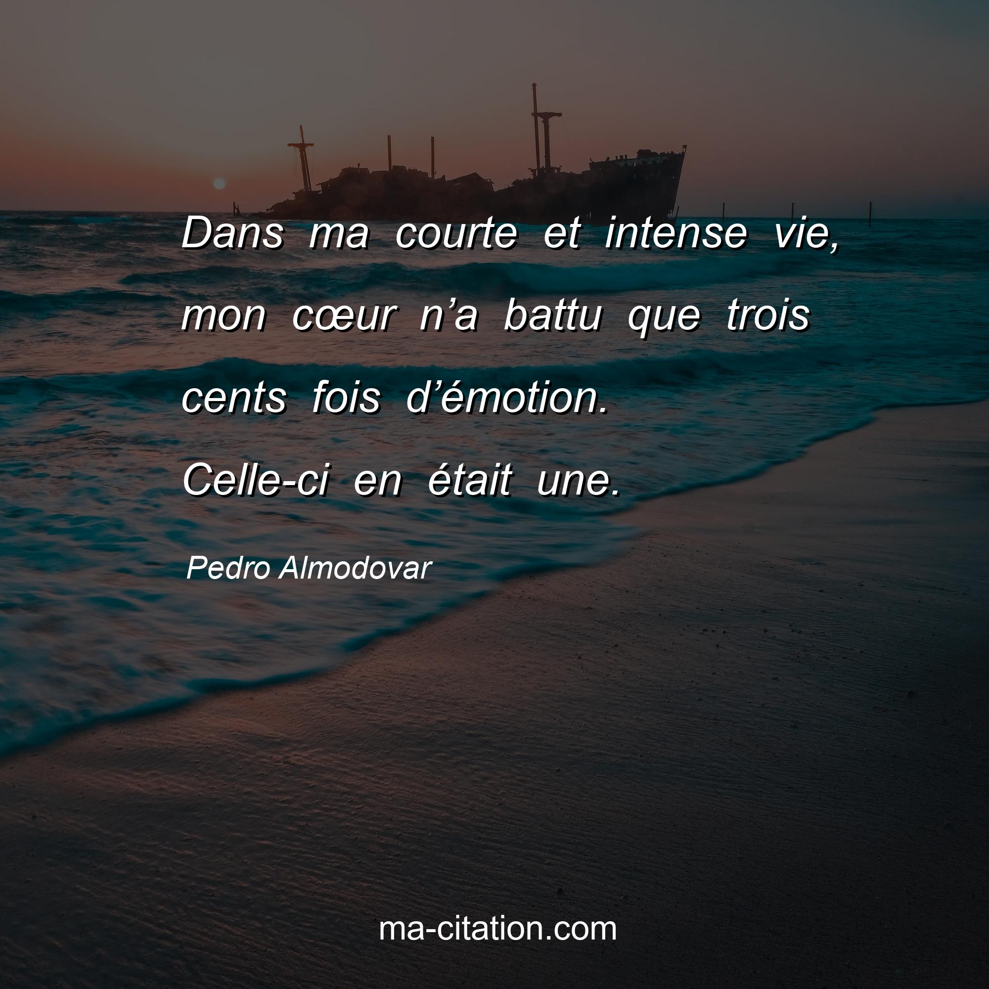 Citation sur la vie de Pedro Almodovar :Dans ma courte et intense vie, mon cœur n’a battu que trois cents fois d’émotion. Celle-ci en était une.