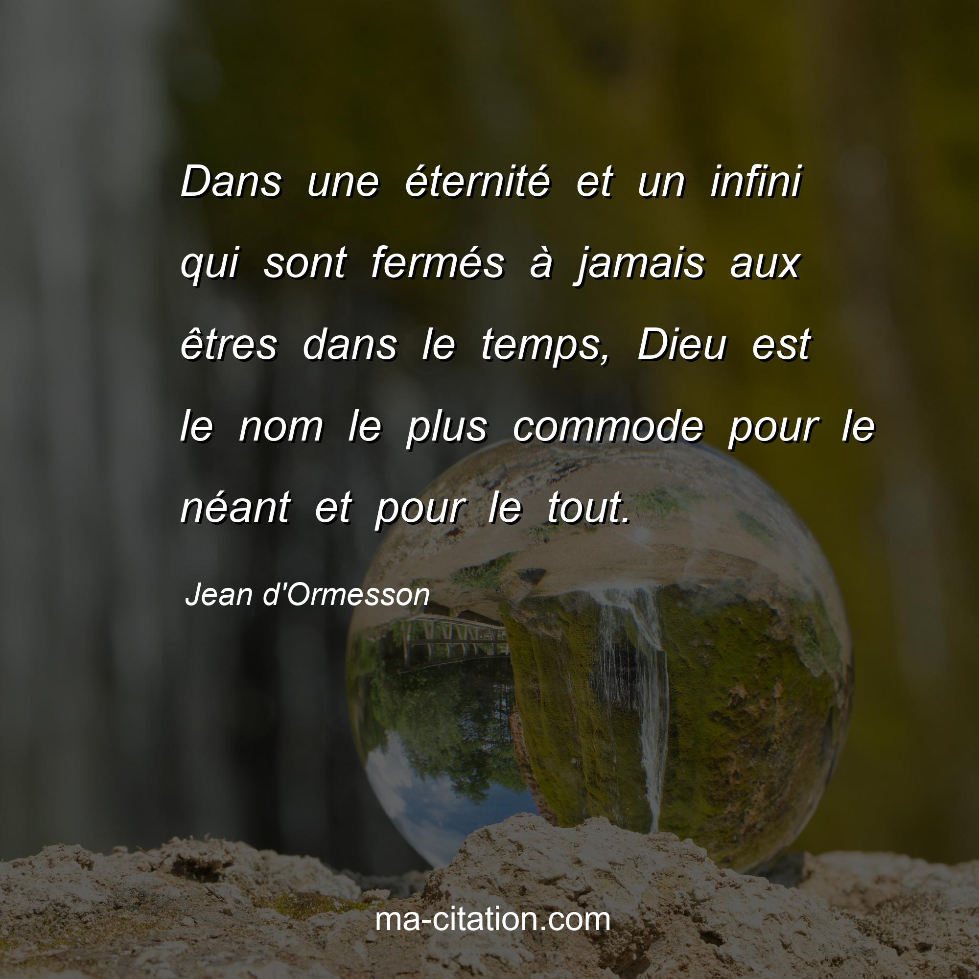 Citation sur la vie de Jean d'Ormesson :Dans une éternité et un infini qui sont fermés à jamais aux êtres dans le temps, Dieu est le nom le plus commode pour le néant et pour le tout.