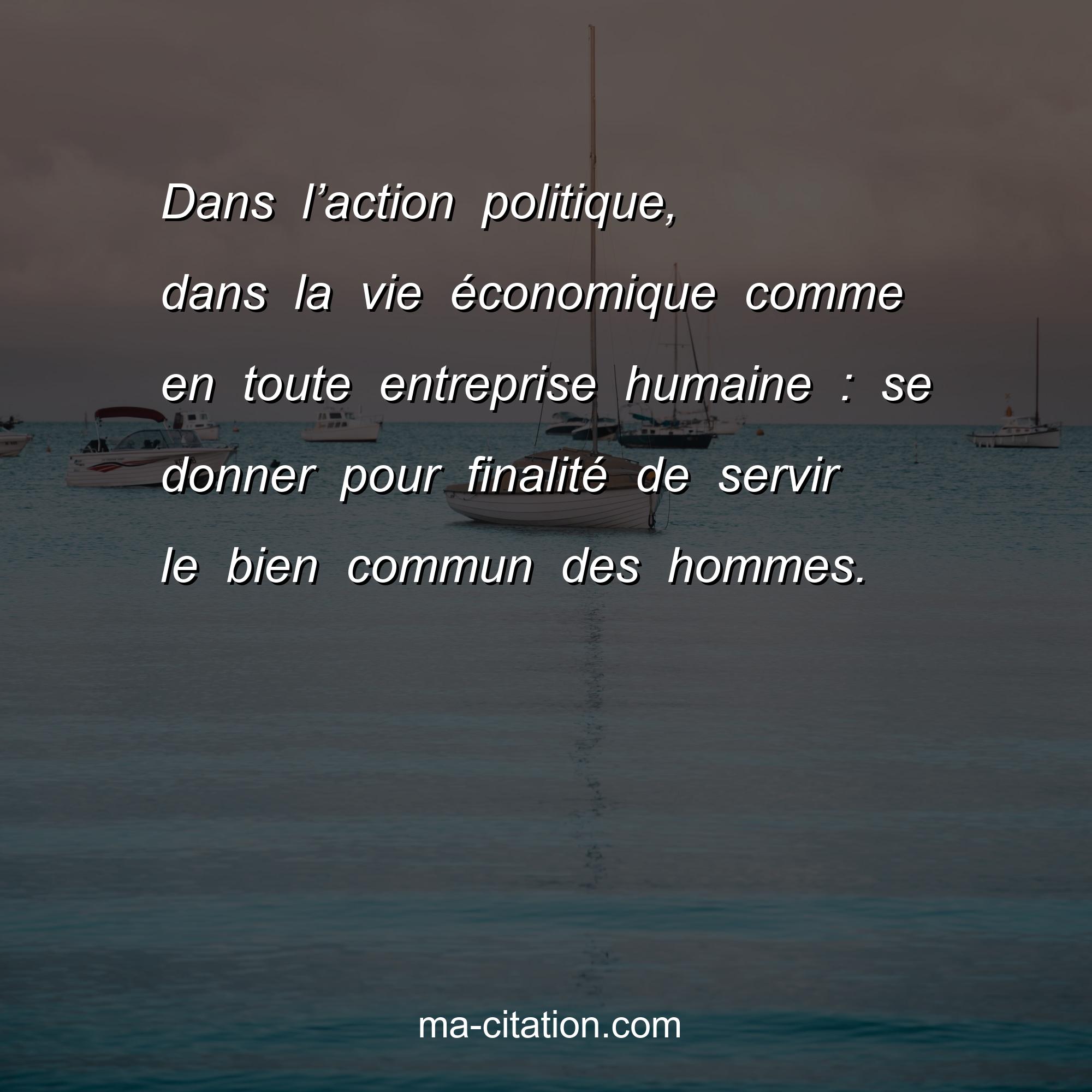 Citation sur la vie :Dans l’action politique, dans la vie économique comme en toute entreprise humaine : se donner pour finalité de servir le bien commun des hommes.