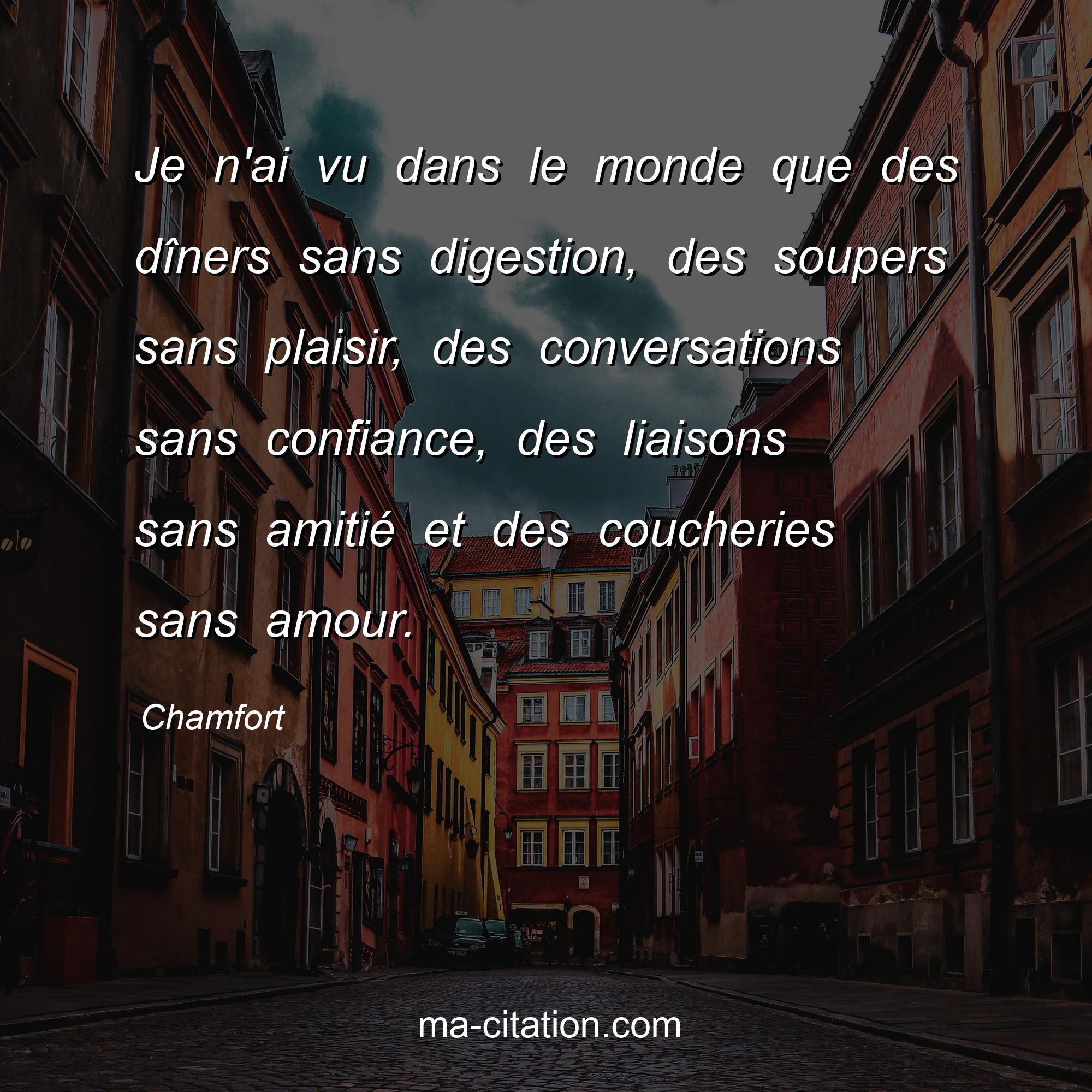 Citation sur la vie de Chamfort :Je n'ai vu dans le monde que des dîners sans digestion, des soupers sans plaisir, des conversations sans confiance, des liaisons sans amitié et des coucheries sans amour.