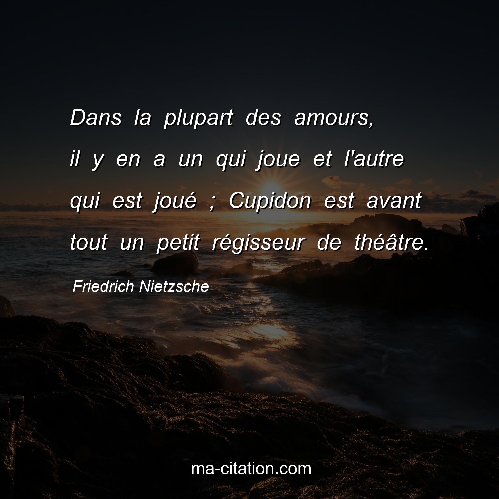 Citation sur la vie de Friedrich Nietzsche :Dans la plupart des amours, il y en a un qui joue et l'autre qui est joué ; Cupidon est avant tout un petit régisseur de théâtre.