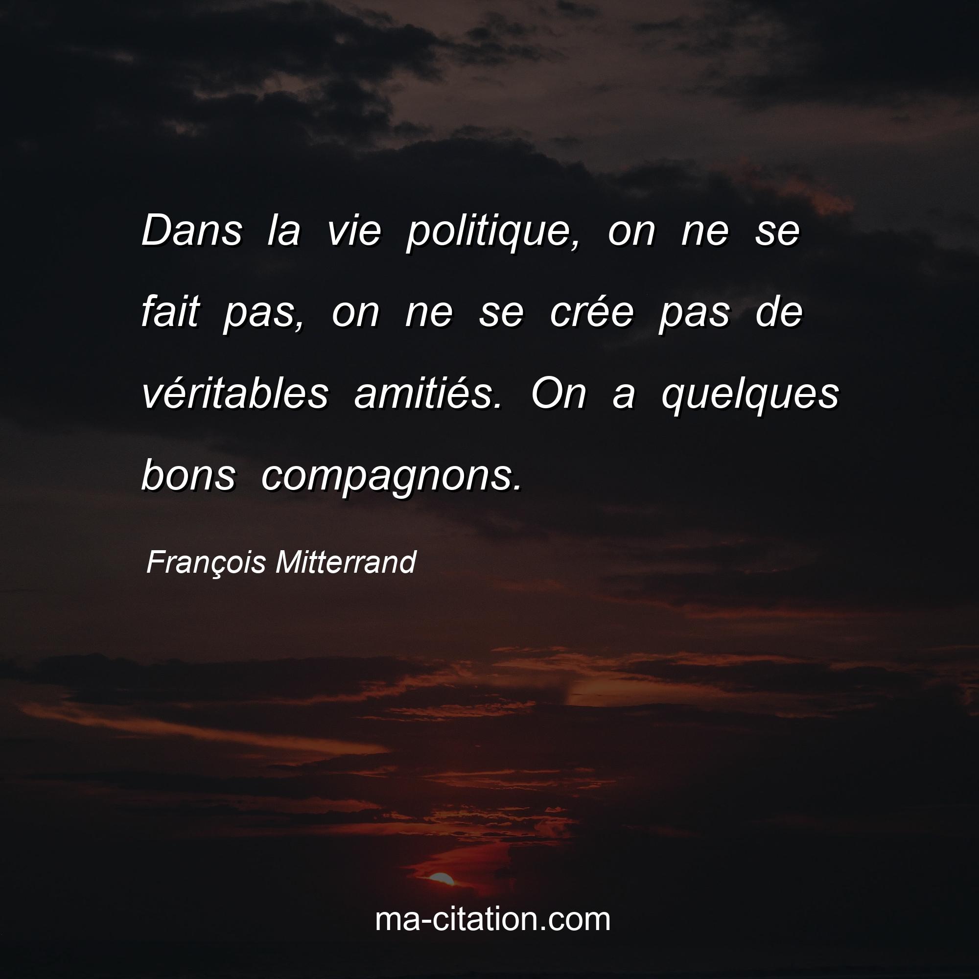Citation sur la vie de François Mitterrand :Dans la vie politique, on ne se fait pas, on ne se crée pas de véritables amitiés. On a quelques bons compagnons.