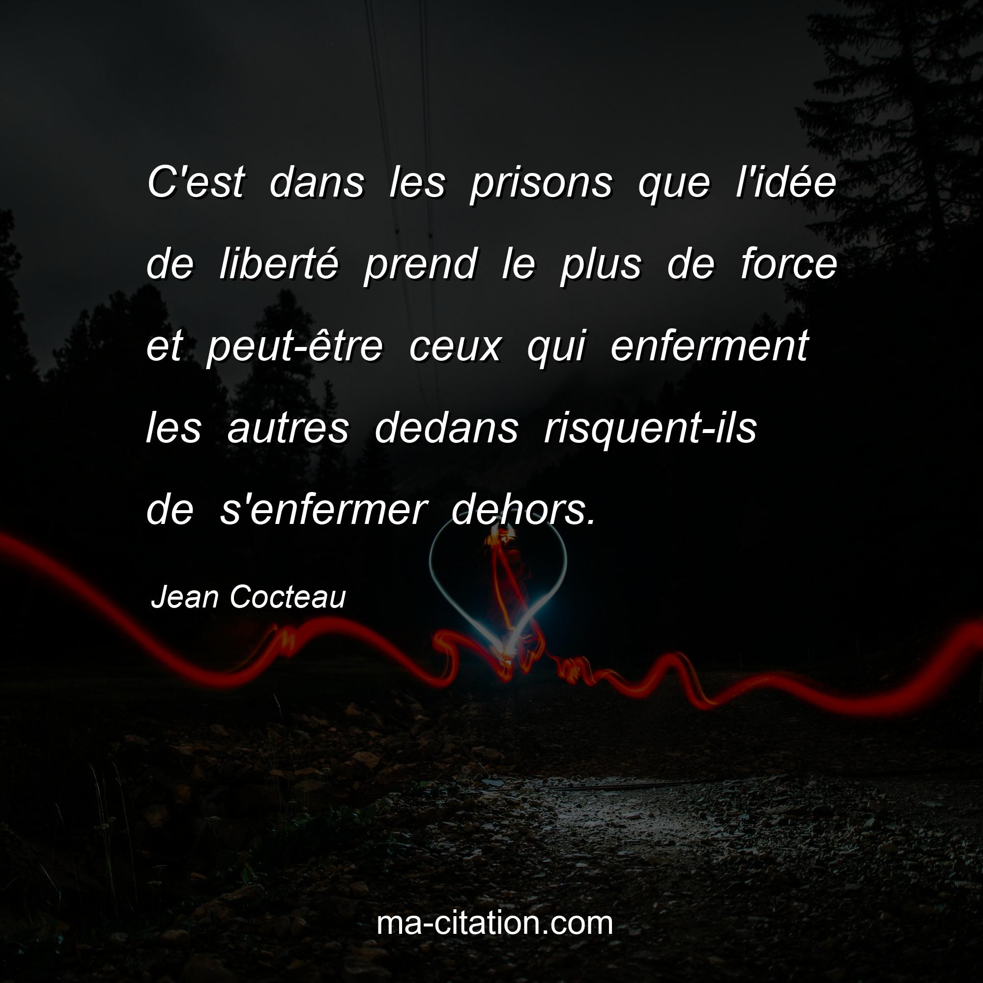 Citation sur la vie de Jean Cocteau :C'est dans les prisons que l'idée de liberté prend le plus de force et peut-être ceux qui enferment les autres dedans risquent-ils de s'enfermer dehors.