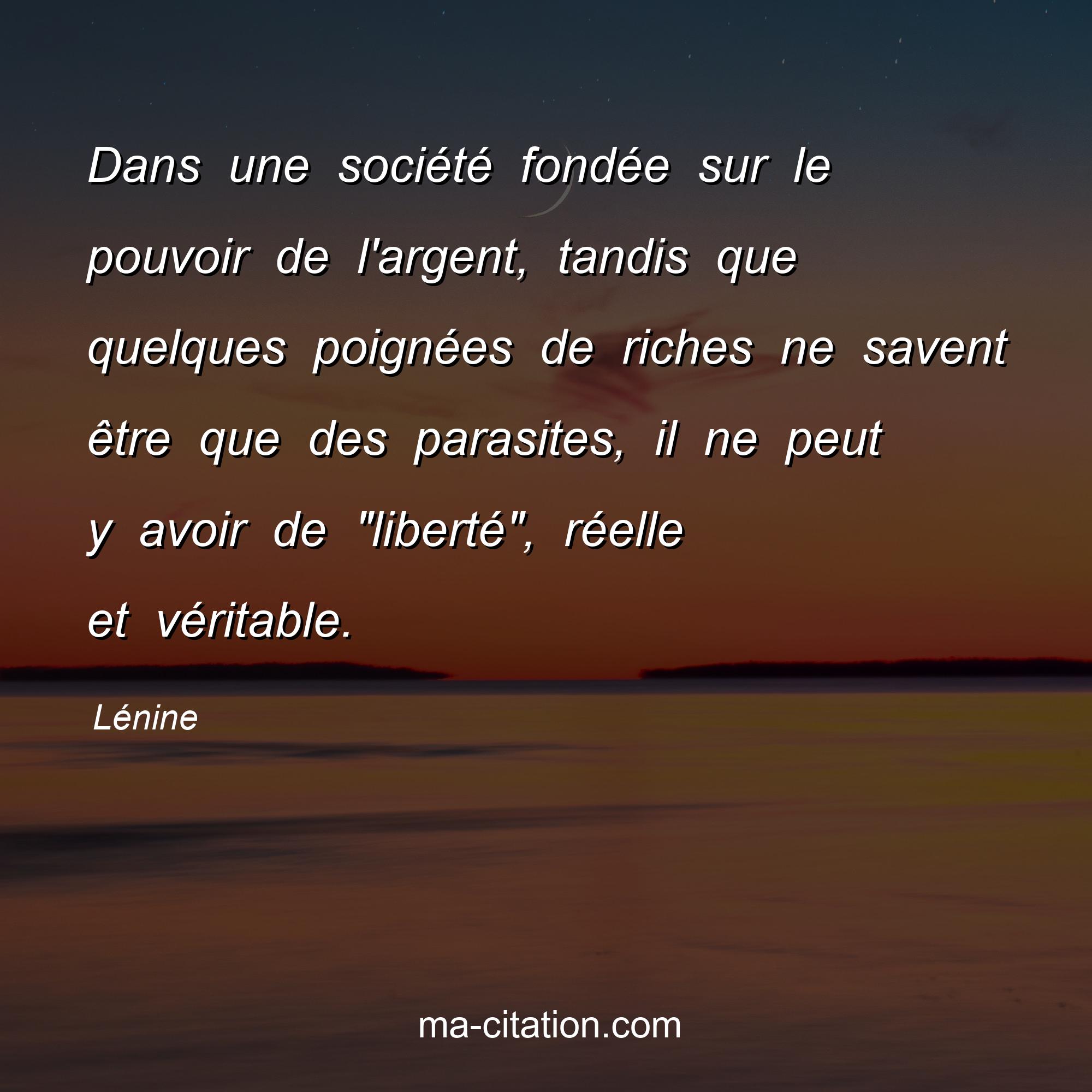 Citation sur la vie de Lénine :Dans une société fondée sur le pouvoir de l'argent, tandis que quelques poignées de riches ne savent être que des parasites, il ne peut y avoir de "liberté", réelle et véritable.