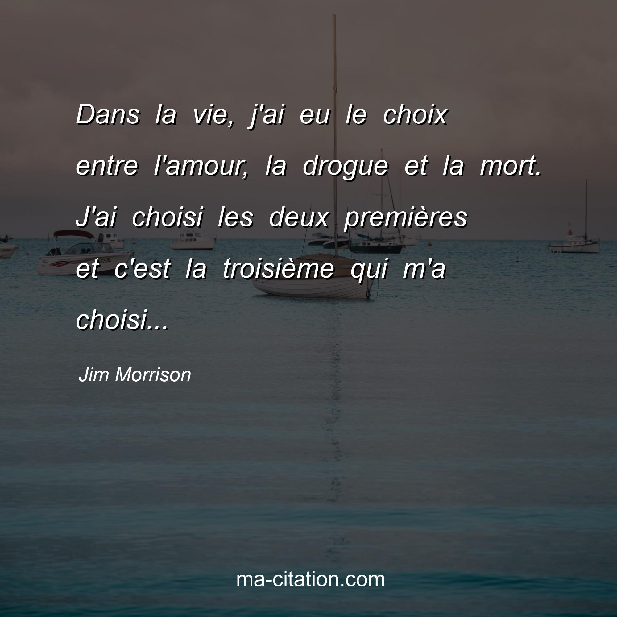 Citation sur la vie de Jim Morrison :Dans la vie, j'ai eu le choix entre l'amour, la drogue et la mort. J'ai choisi les deux premières et c'est la troisième qui m'a choisi...