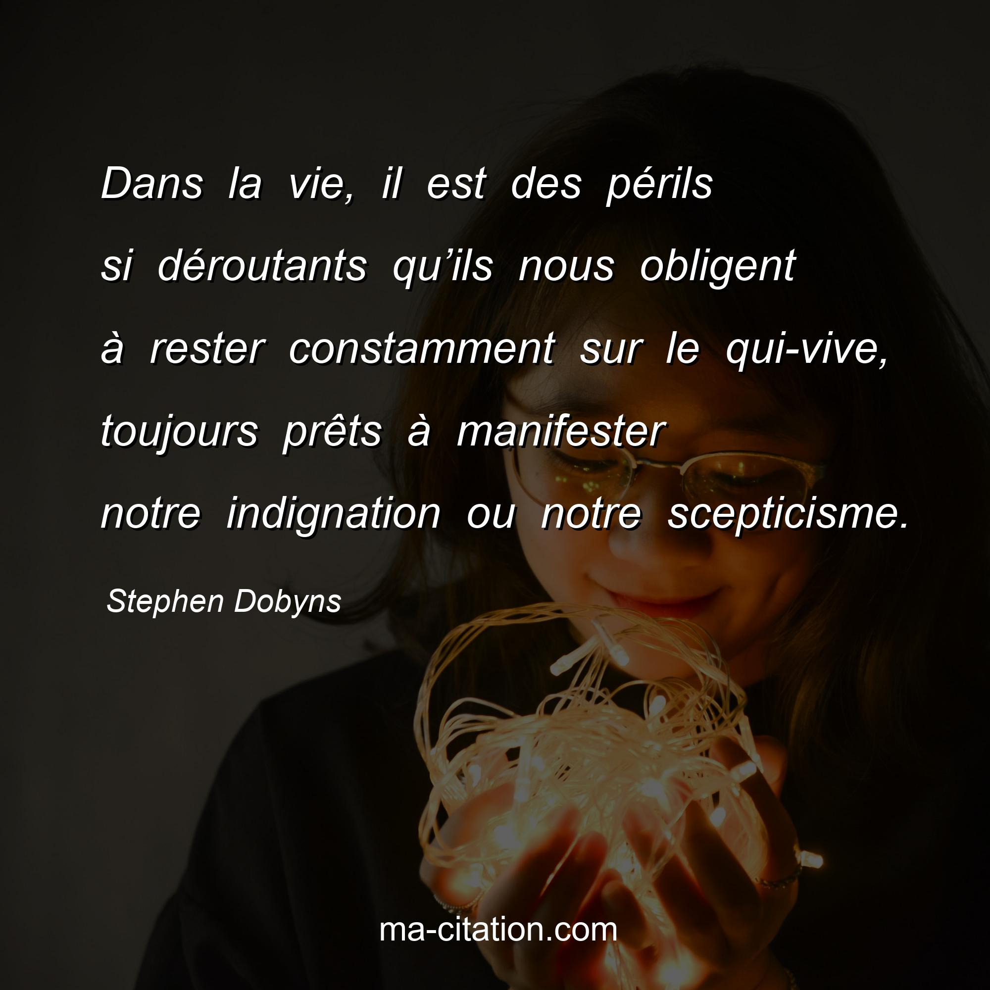 Citation sur la vie de Stephen Dobyns :Dans la vie, il est des périls si déroutants qu’ils nous obligent à rester constamment sur le qui-vive, toujours prêts à manifester notre indignation ou notre scepticisme.