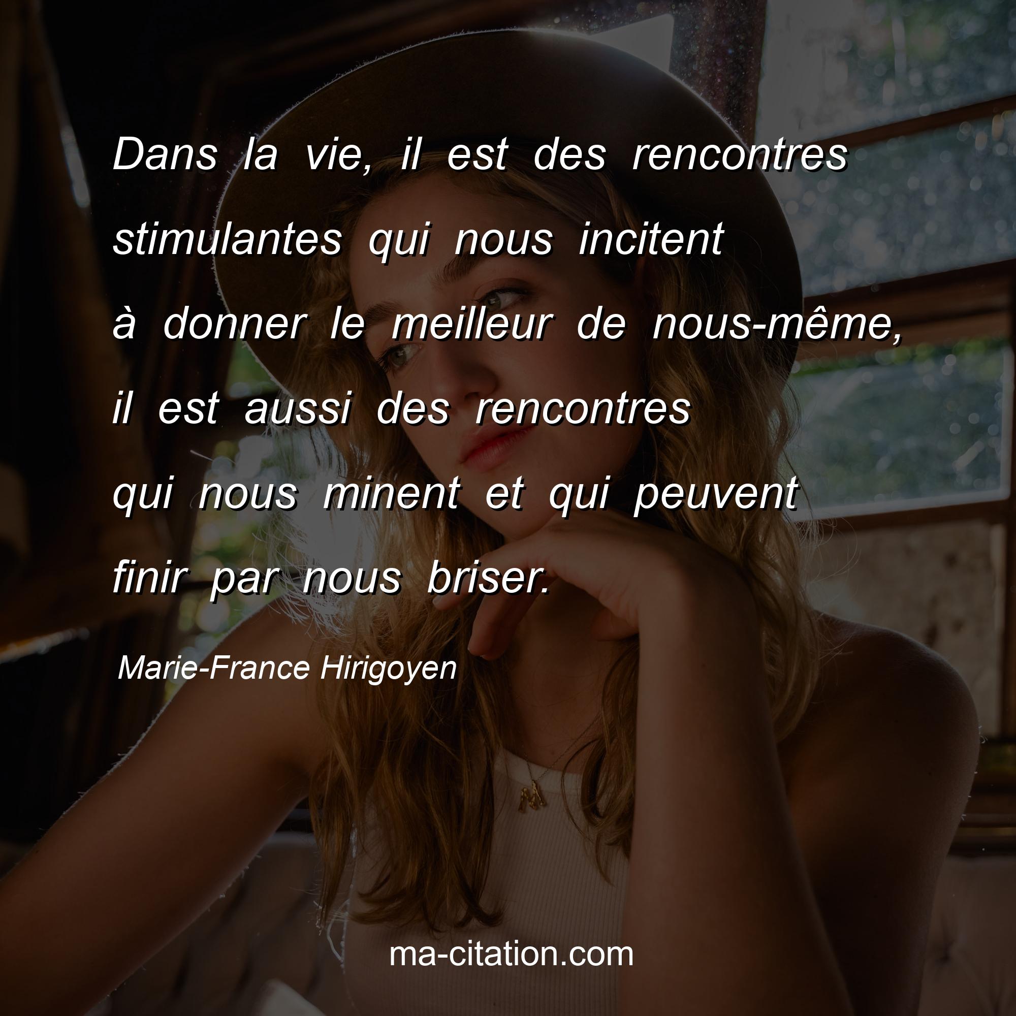 Citation sur la vie de Marie-France Hirigoyen :Dans la vie, il est des rencontres stimulantes qui nous incitent à donner le meilleur de nous-même, il est aussi des rencontres qui nous minent et qui peuvent finir par nous briser.