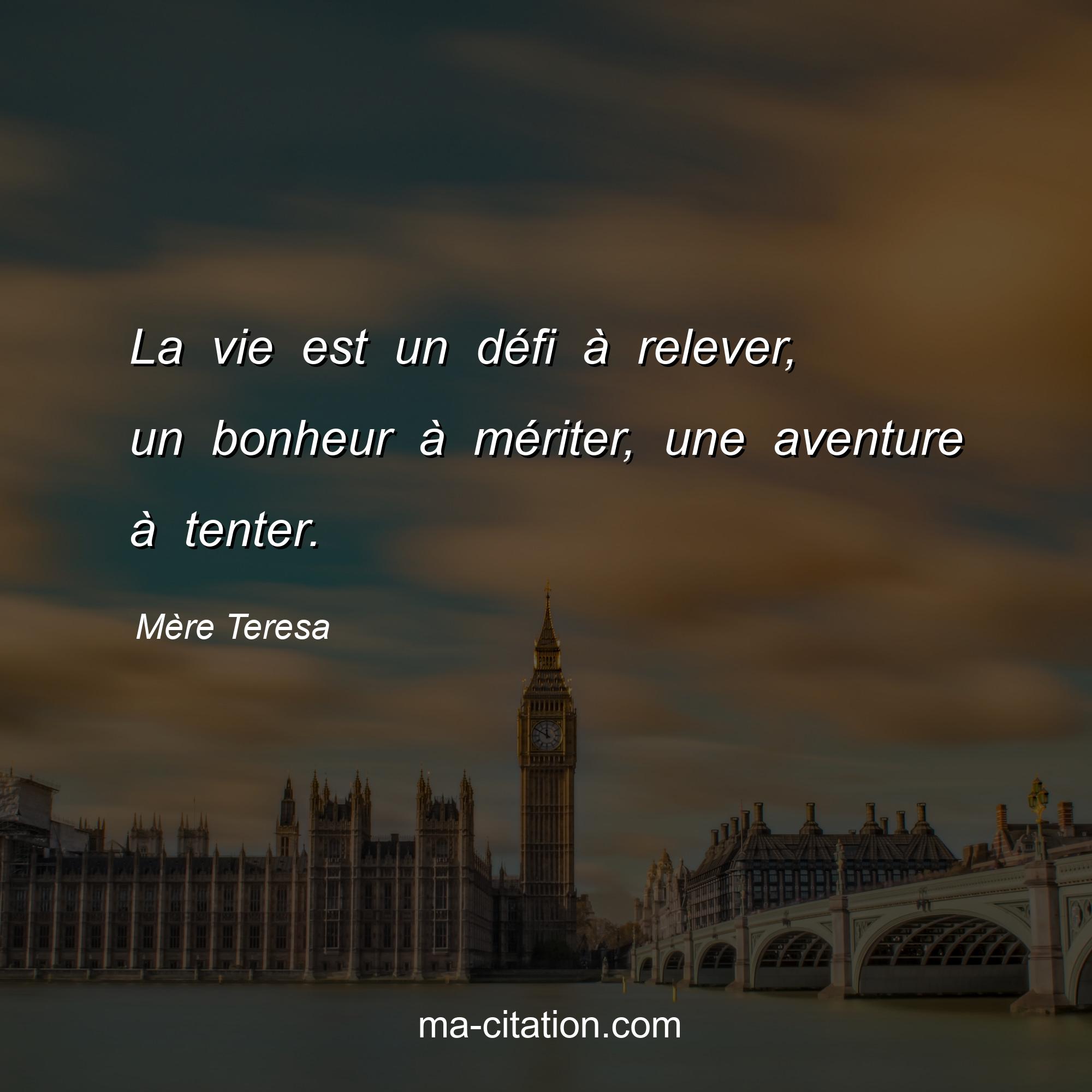Citation sur la vie de Mère Teresa :La vie est un défi à relever, un bonheur à mériter, une aventure à tenter.