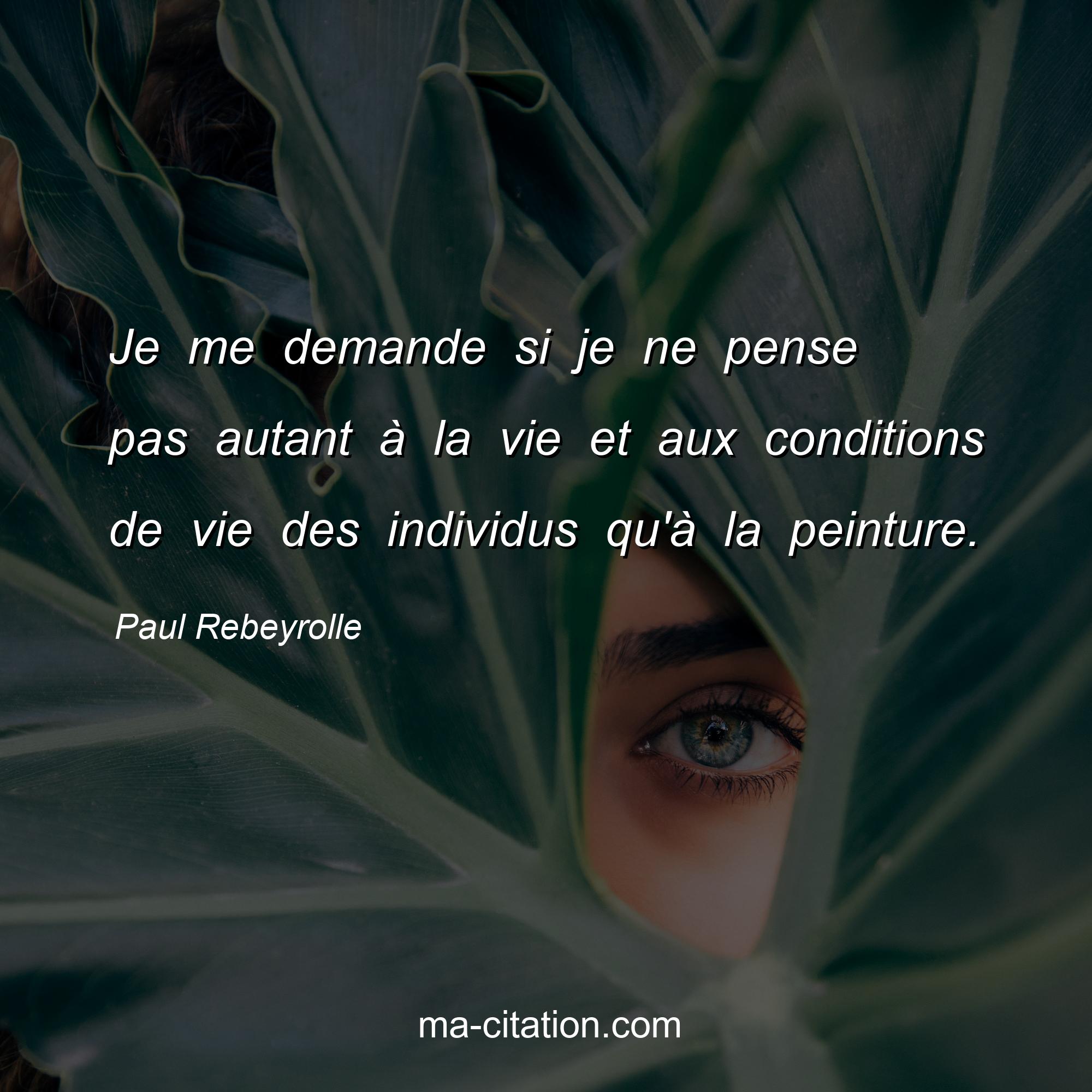 Citation sur la vie de Paul Rebeyrolle :Je me demande si je ne pense pas autant à la vie et aux conditions de vie des individus qu'à la peinture.