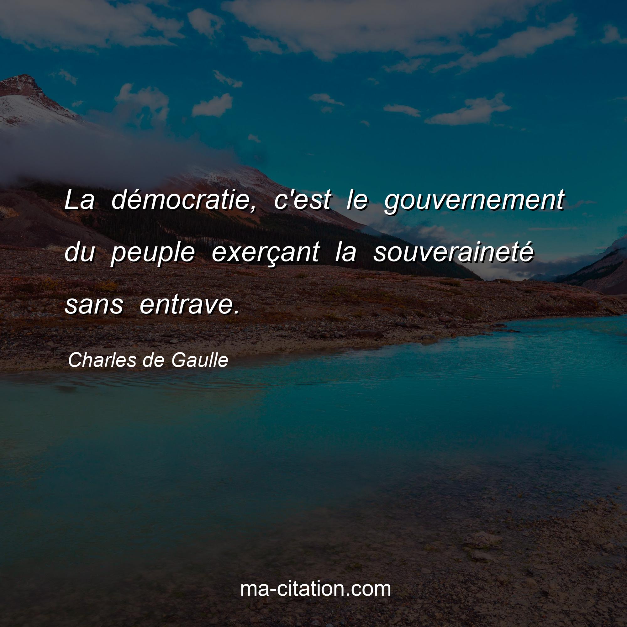 Citation sur la vie de Charles de Gaulle :La démocratie, c'est le gouvernement du peuple exerçant la souveraineté sans entrave.