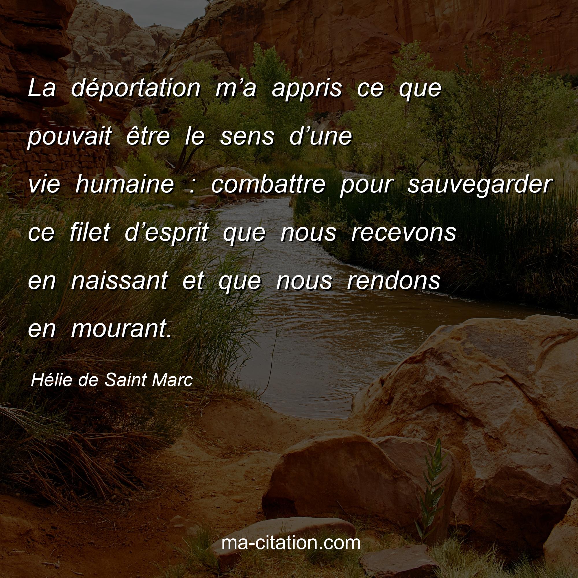 Citation sur la vie de Hélie de Saint Marc :La déportation m’a appris ce que pouvait être le sens d’une vie humaine : combattre pour sauvegarder ce filet d’esprit que nous recevons en naissant et que nous rendons en mourant.