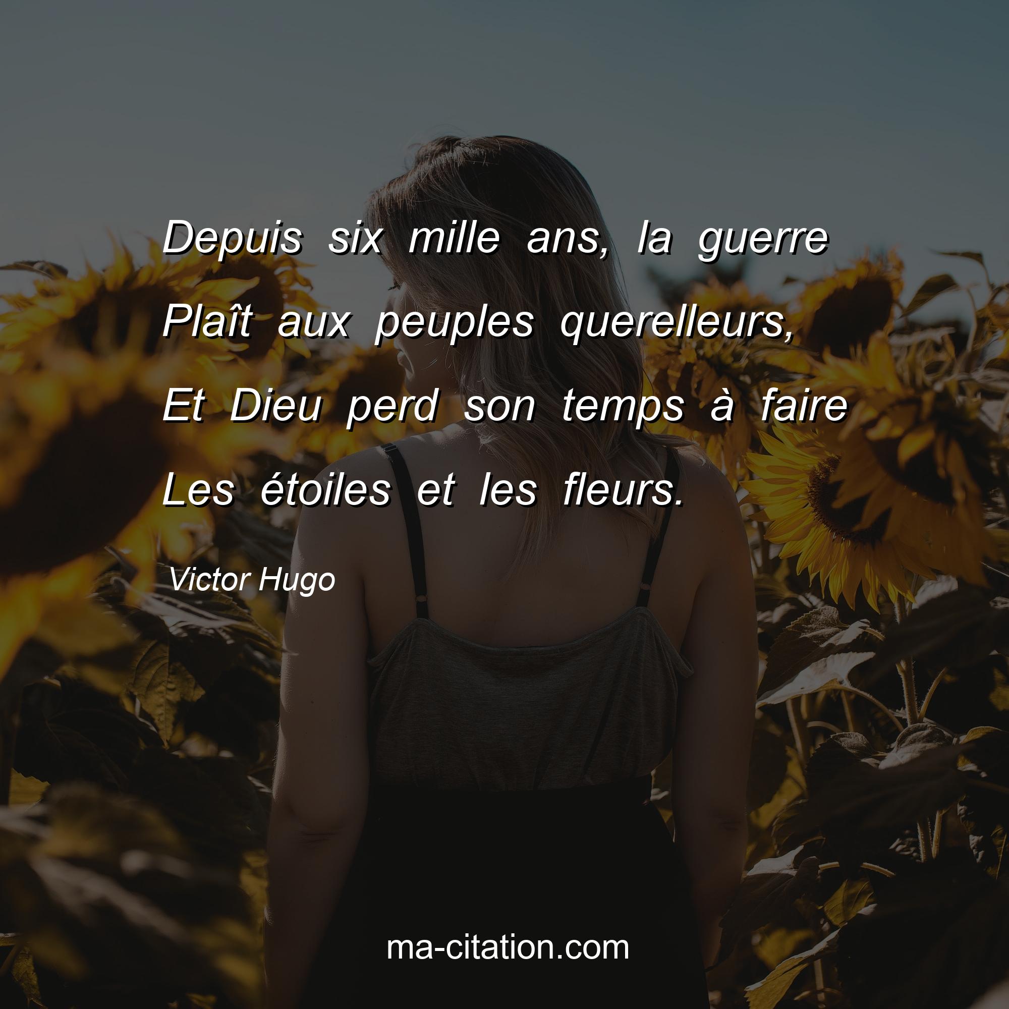Citation sur la vie de Victor Hugo :Depuis six mille ans, la guerre Plaît aux peuples querelleurs, Et Dieu perd son temps à faire Les étoiles et les fleurs.