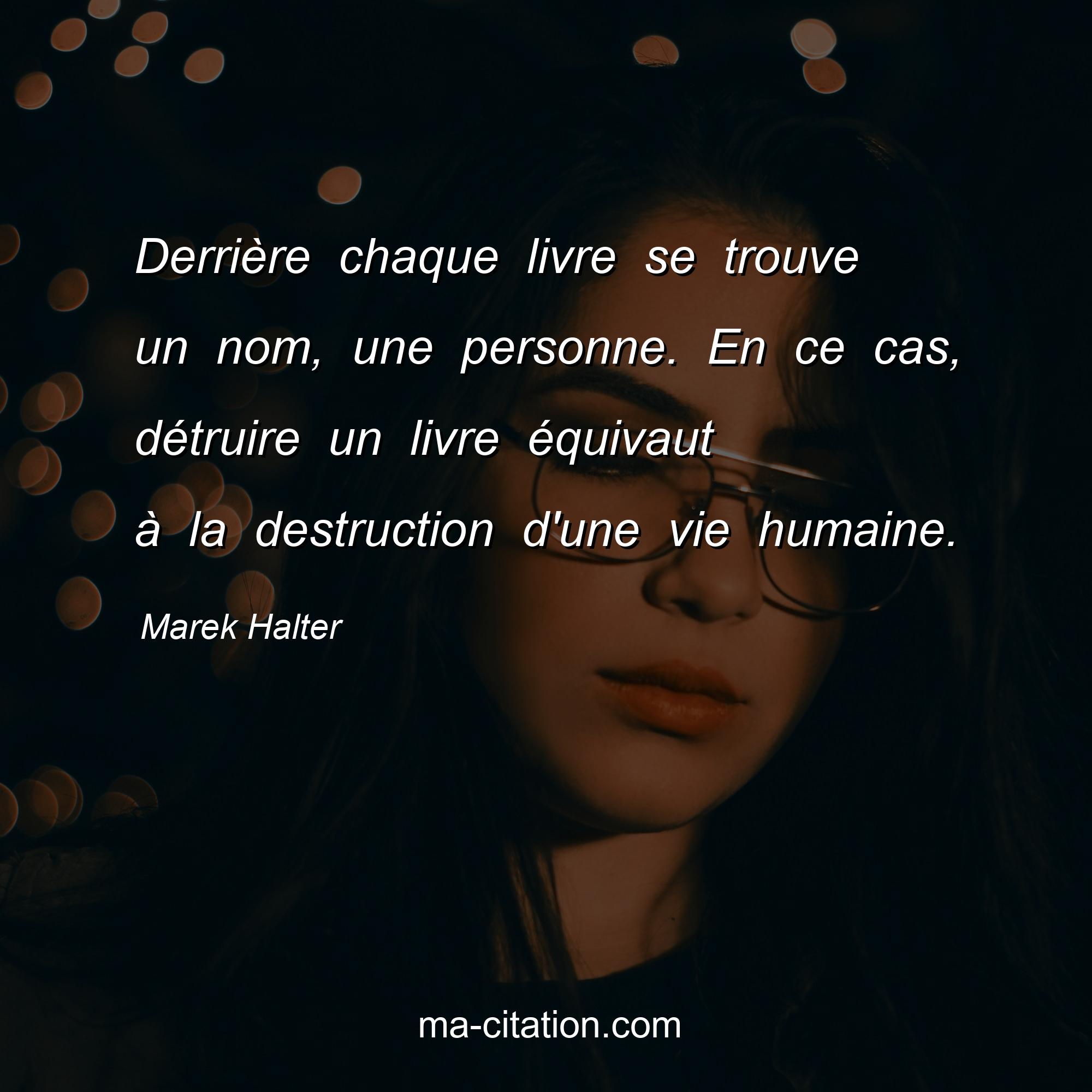Citation sur la vie de Marek Halter :Derrière chaque livre se trouve un nom, une personne. En ce cas, détruire un livre équivaut à la destruction d'une vie humaine.