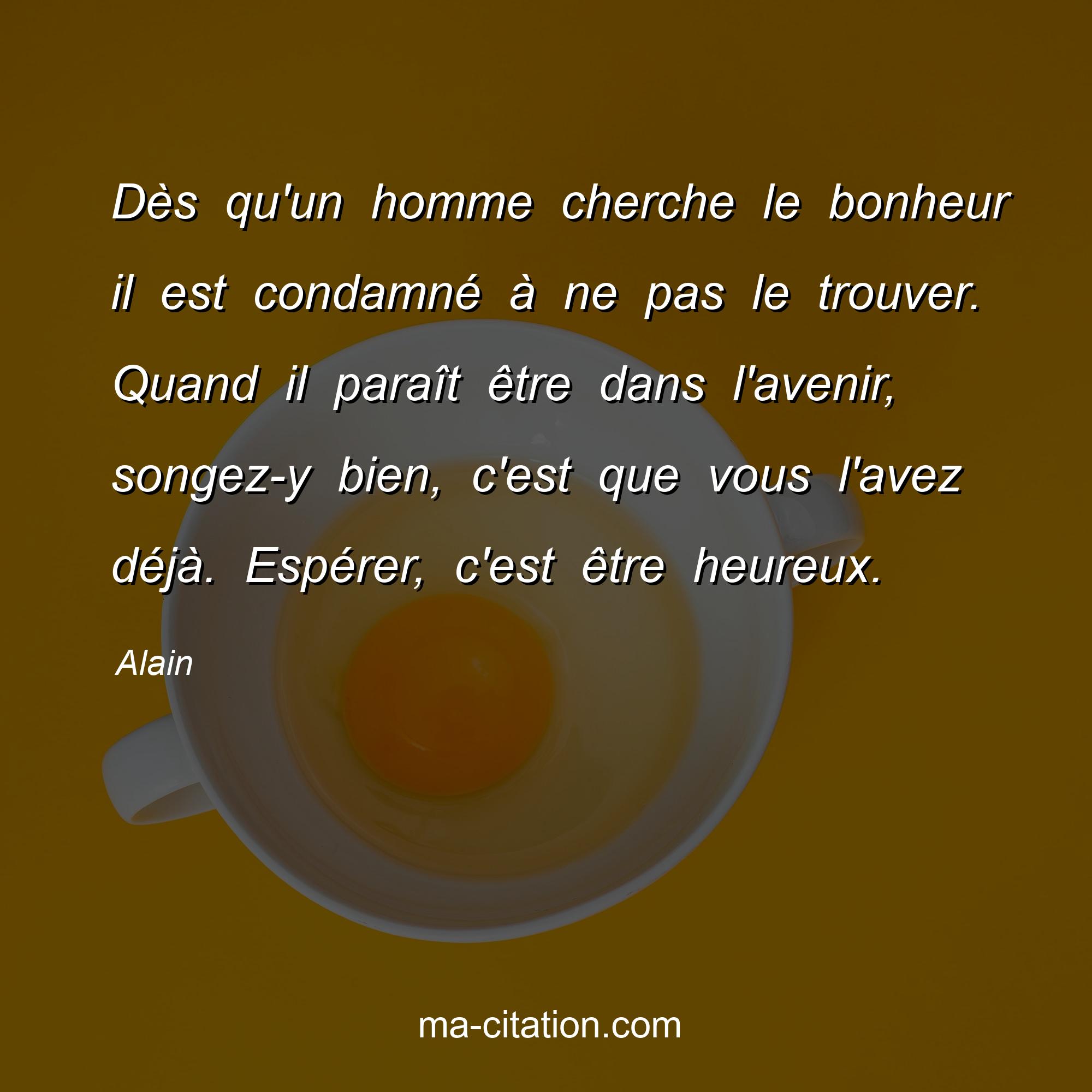 Citation sur la vie d'Alain :Dès qu'un homme cherche le bonheur il est condamné à ne pas le trouver. Quand il paraît être dans l'avenir, songez-y bien, c'est que vous l'avez déjà . Espérer, c'est être heureux.