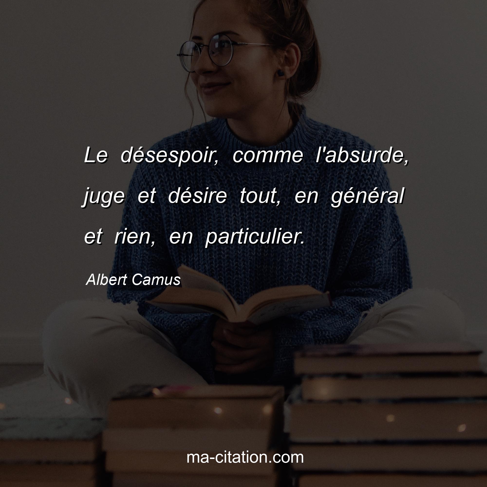 Citation sur la vie d'Albert Camus :Le désespoir, comme l'absurde, juge et désire tout, en général et rien, en particulier.
