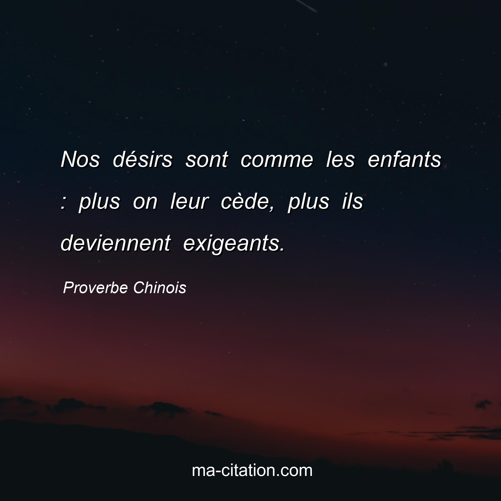 Proverbe Chinois sur la vie :Nos désirs sont comme les enfants : plus on leur cède, plus ils deviennent exigeants.