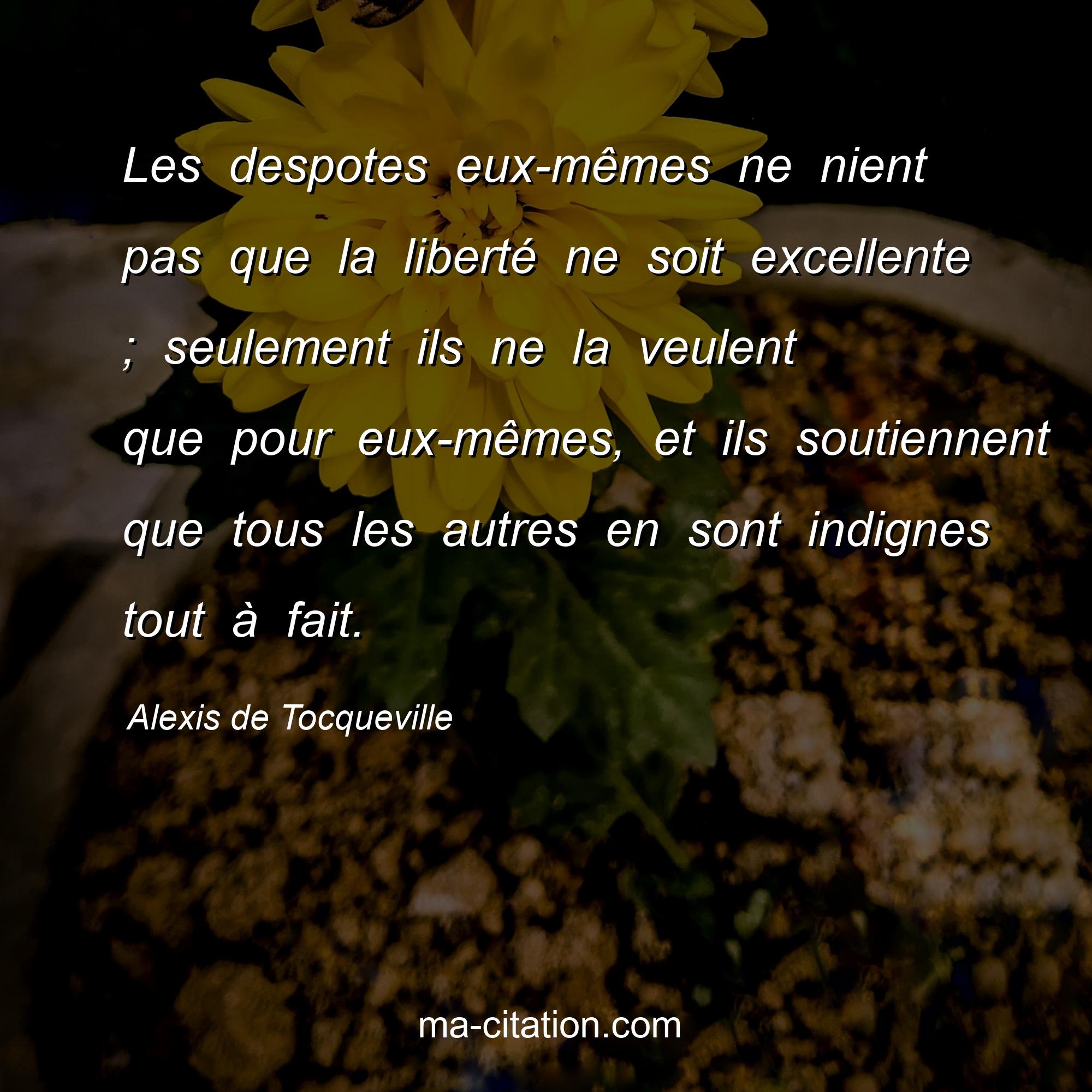 Citation sur la vie d'Alexis de Tocqueville :Les despotes eux-mêmes ne nient pas que la liberté ne soit excellente ; seulement ils ne la veulent que pour eux-mêmes, et ils soutiennent que tous les autres en sont indignes tout à fait.