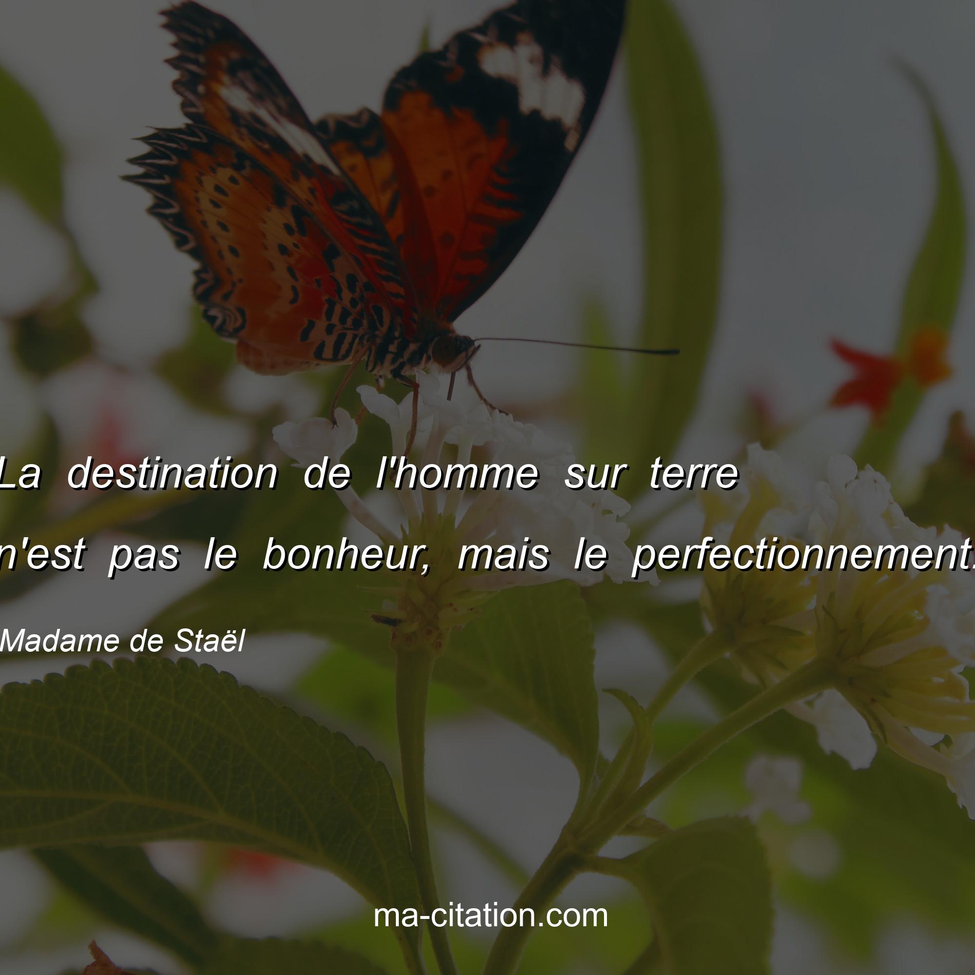 Madame de Staël est l'auteur de la citation sur la vie "La destination de l'homme sur terre n'est pas le bonheur, mais le perfectionnement.".