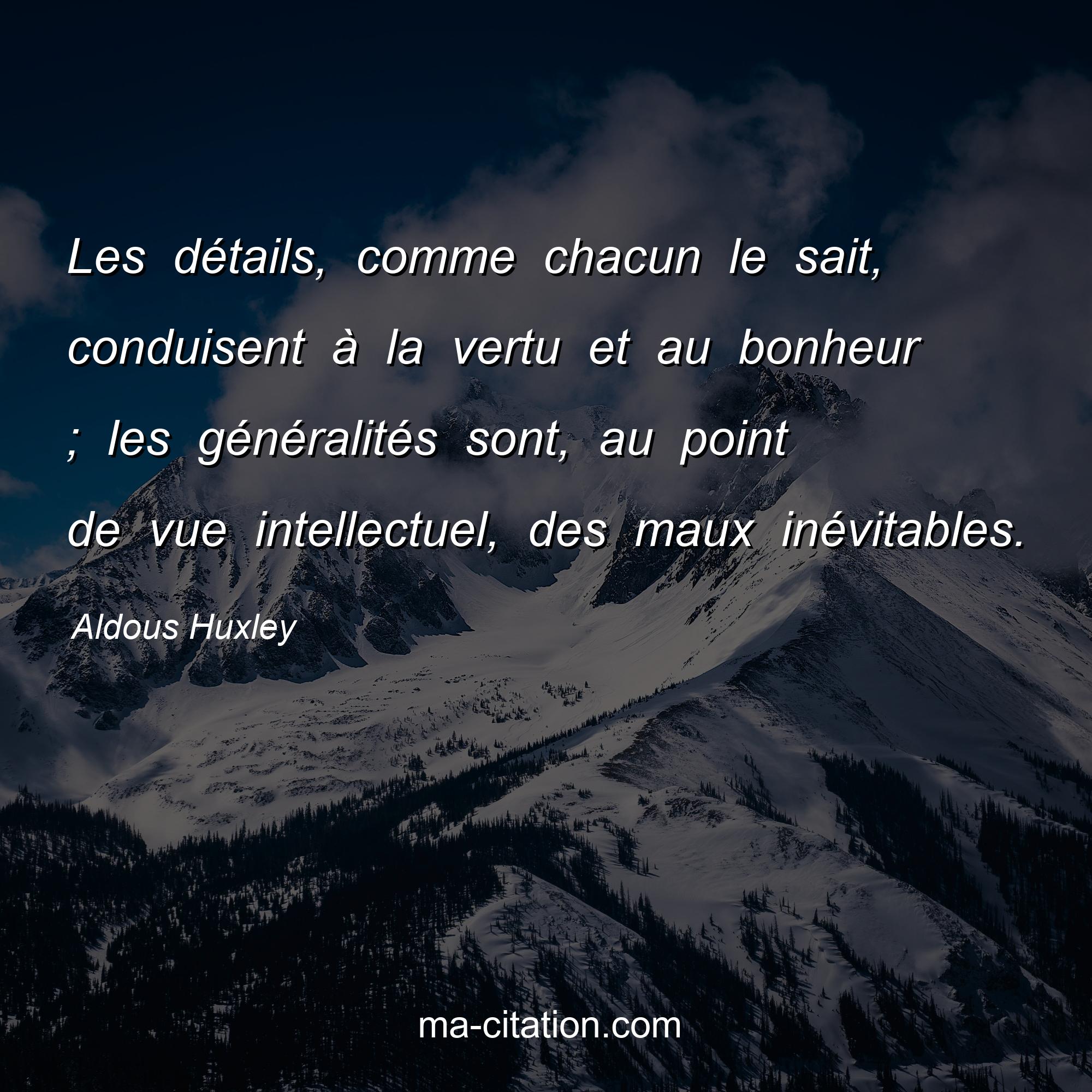 Citation sur la vie d'Aldous Huxley :Les détails, comme chacun le sait, conduisent à la vertu et au bonheur ; les généralités sont, au point de vue intellectuel, des maux inévitables.
