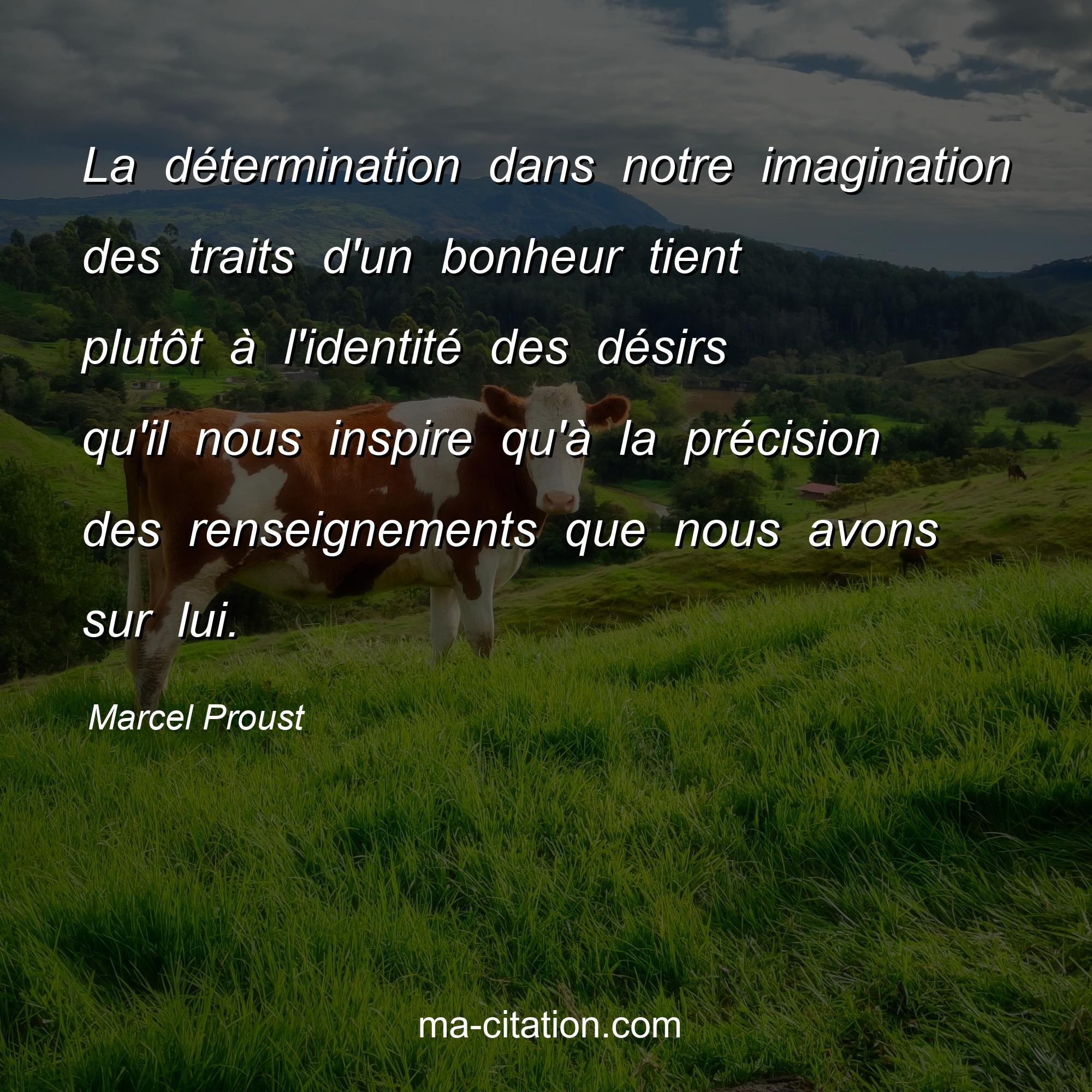 Citation sur la vie de Marcel Proust :La détermination dans notre imagination des traits d'un bonheur tient plutôt à l'identité des désirs qu'il nous inspire qu'à la précision des renseignements que nous avons sur lui.