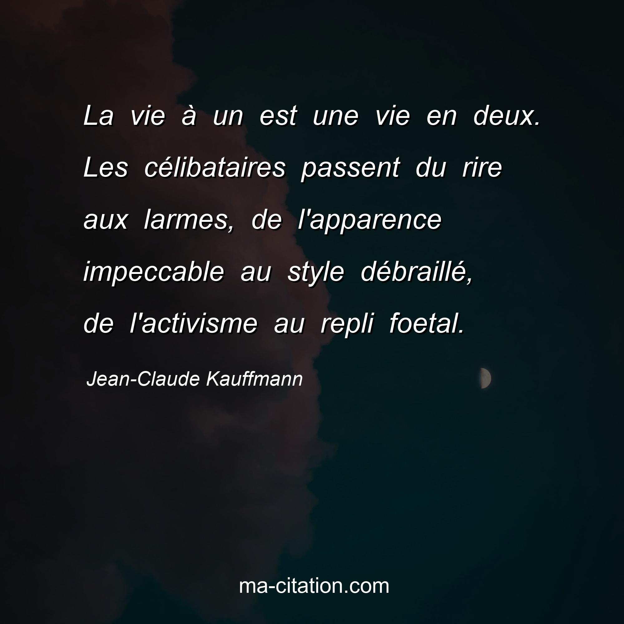Citation sur la vie de Jean-Claude Kauffmann :La vie à un est une vie en deux. Les célibataires passent du rire aux larmes, de l'apparence impeccable au style débraillé, de l'activisme au repli foetal.