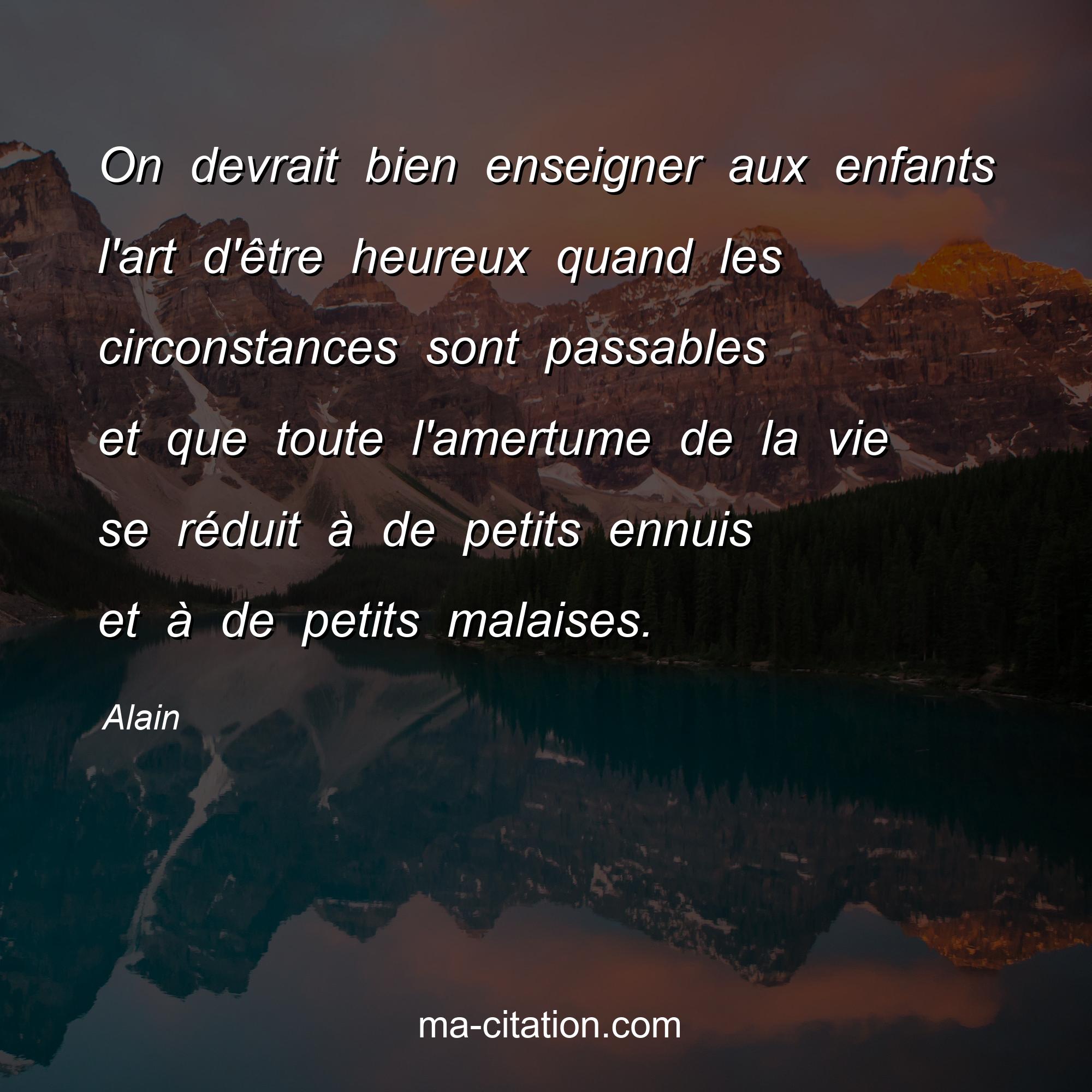 Citation sur la vie d'Alain :On devrait bien enseigner aux enfants l'art d'être heureux quand les circonstances sont passables et que toute l'amertume de la vie se réduit à de petits ennuis et à de petits malaises.