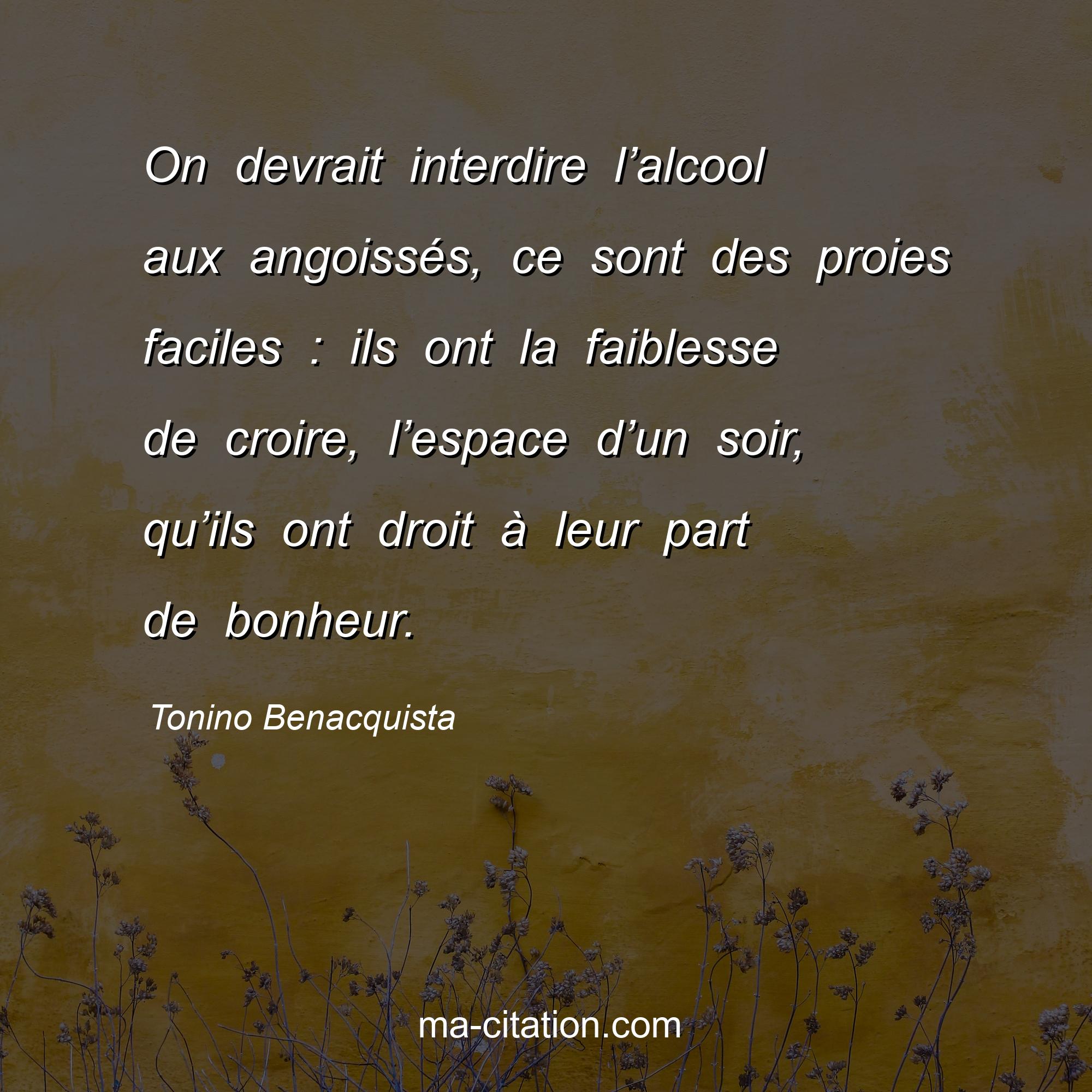 Citation sur la vie de Tonino Benacquista :On devrait interdire l’alcool aux angoissés, ce sont des proies faciles : ils ont la faiblesse de croire, l’espace d’un soir, qu’ils ont droit à leur part de bonheur.