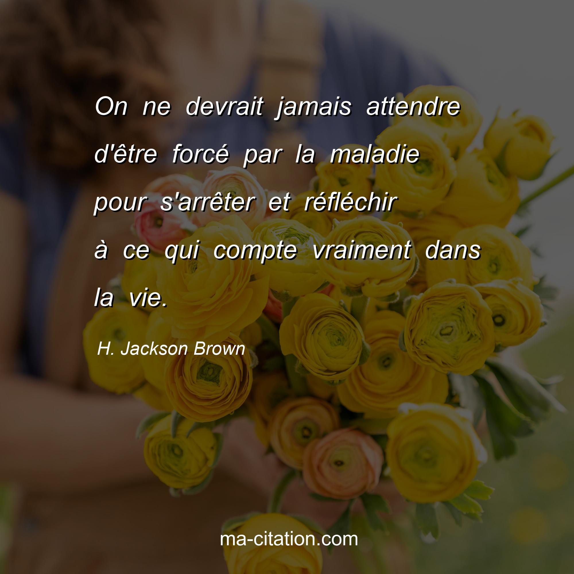 H. Jackson Brown est l'auteur de la citation sur la vie "On ne devrait jamais attendre d'être forcé par la maladie pour s'arrêter et réfléchir à ce qui compte vraiment dans la vie.".