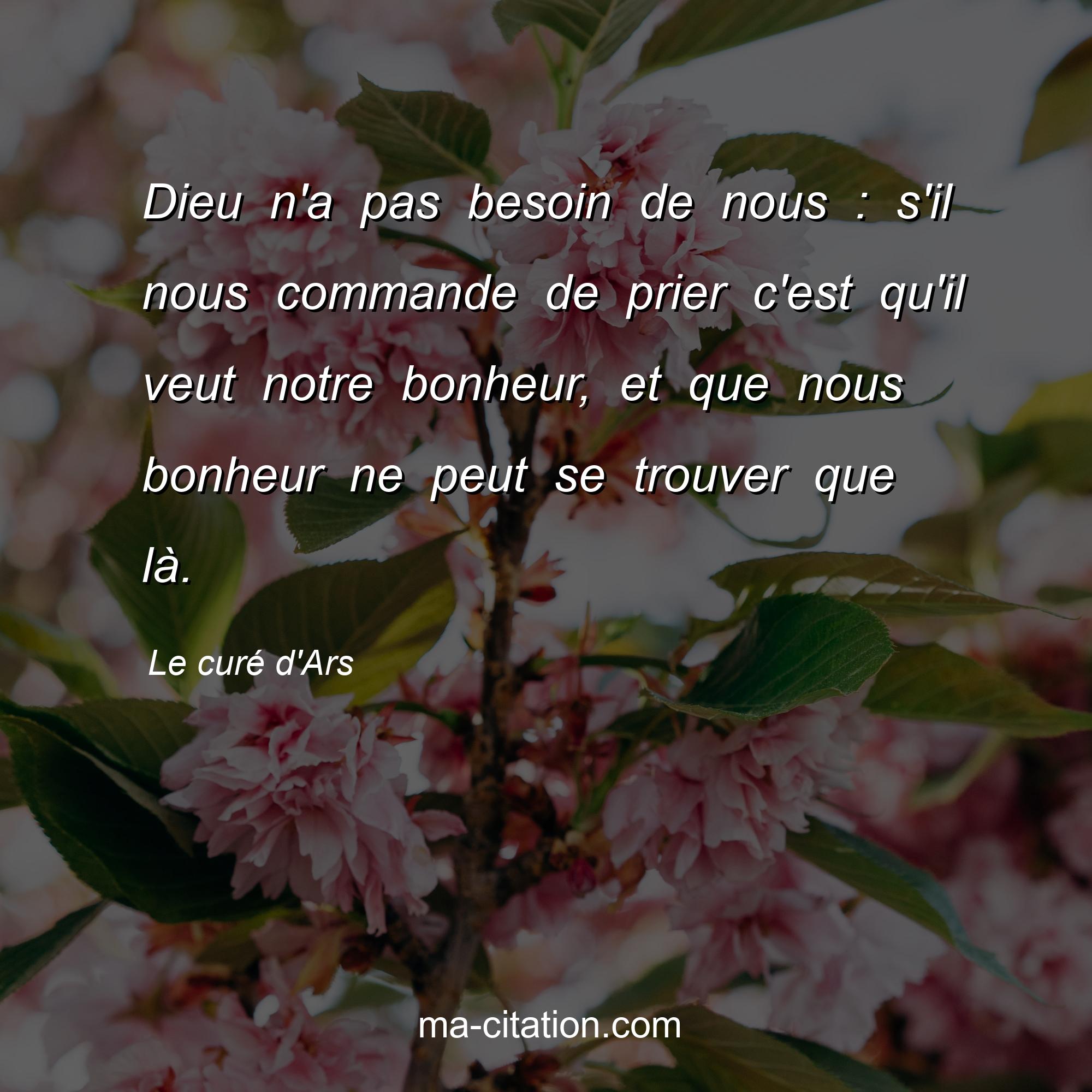 Citation sur la vie de Le curé d'Ars :Dieu n'a pas besoin de nous : s'il nous commande de prier c'est qu'il veut notre bonheur, et que nous bonheur ne peut se trouver que là .