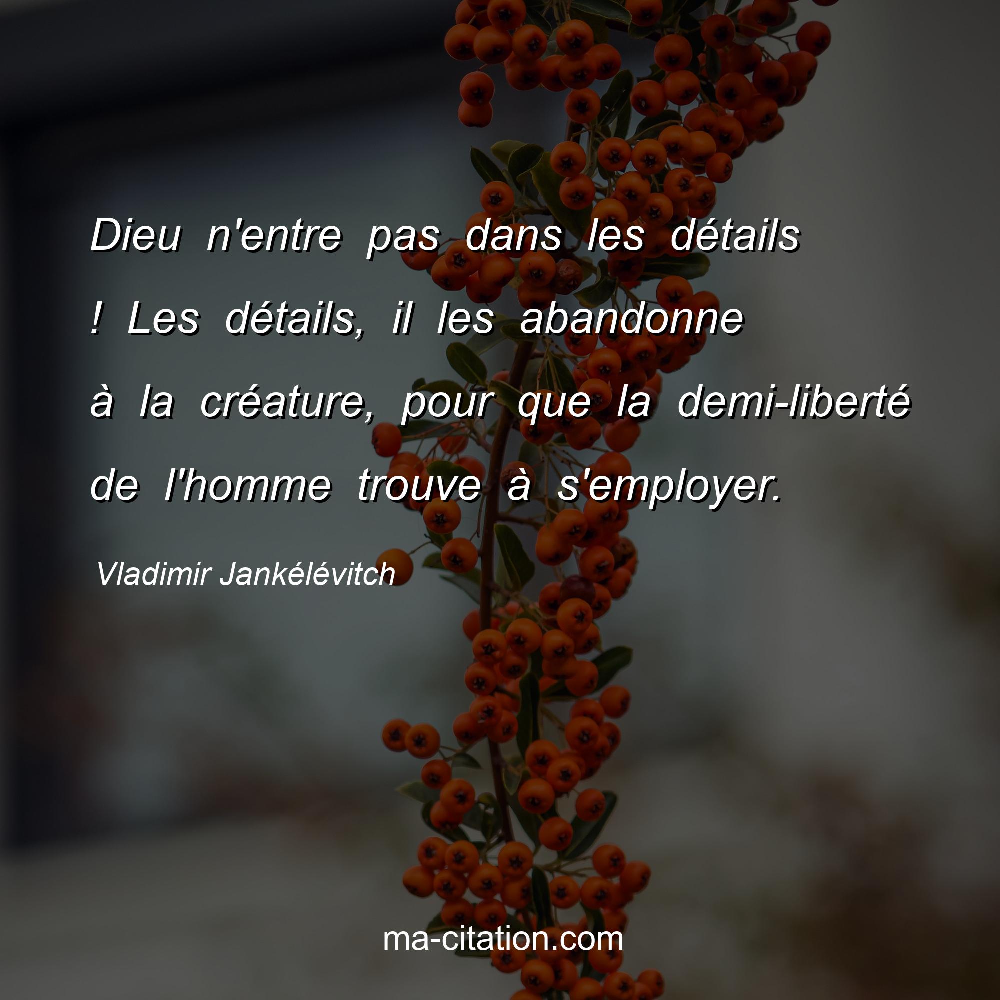 Citation sur la vie de Vladimir Jankélévitch :Dieu n'entre pas dans les détails ! Les détails, il les abandonne à la créature, pour que la demi-liberté de l'homme trouve à s'employer.
