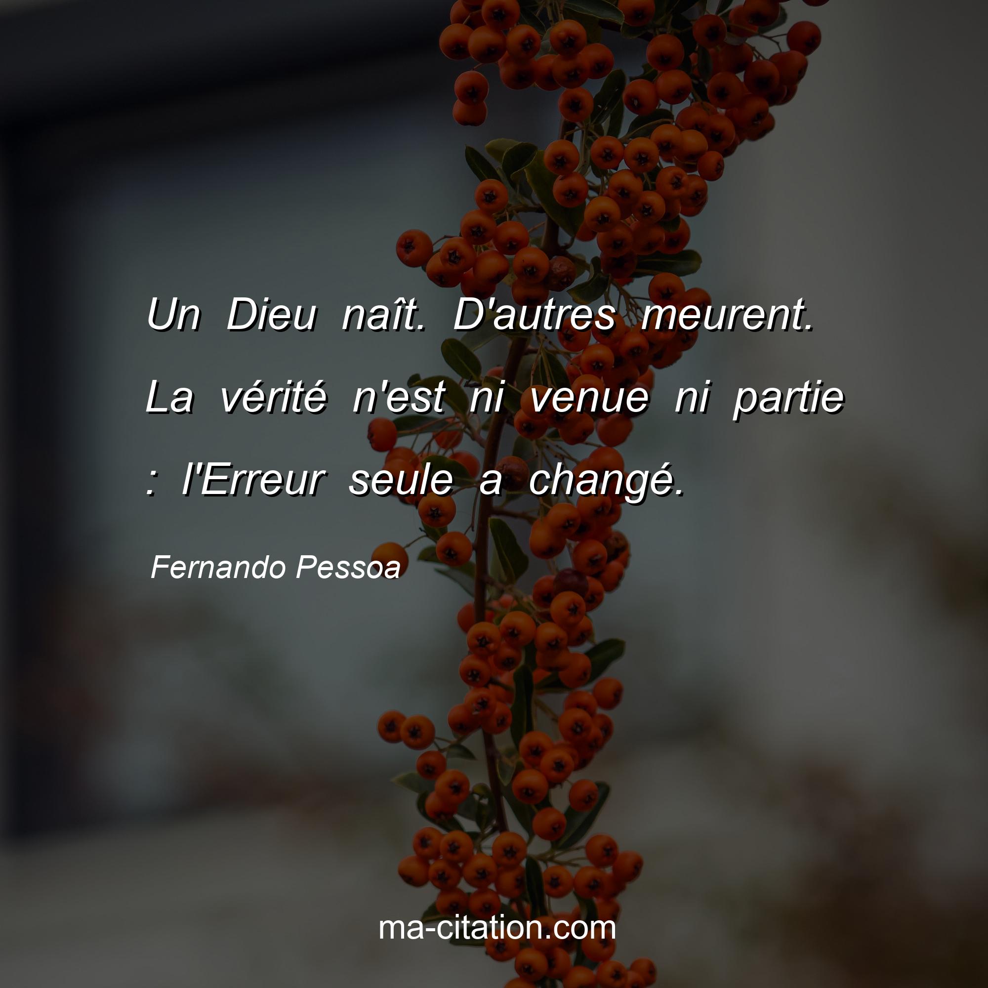 Citation sur la vie de Fernando Pessoa :Un Dieu naît. D'autres meurent. La vérité n'est ni venue ni partie : l'Erreur seule a changé.