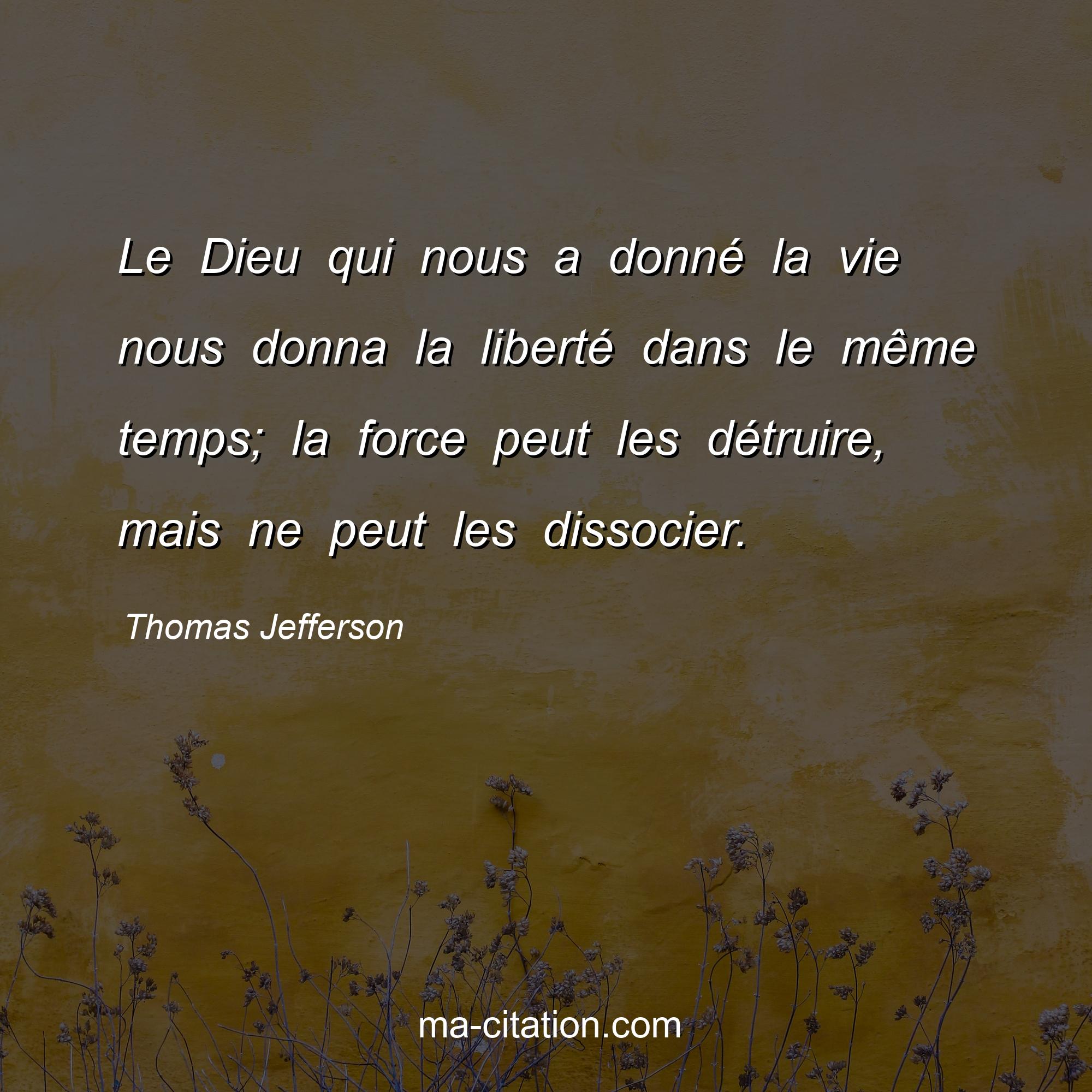 Citation sur la vie de Thomas Jefferson :Le Dieu qui nous a donné la vie nous donna la liberté dans le même temps; la force peut les détruire, mais ne peut les dissocier.