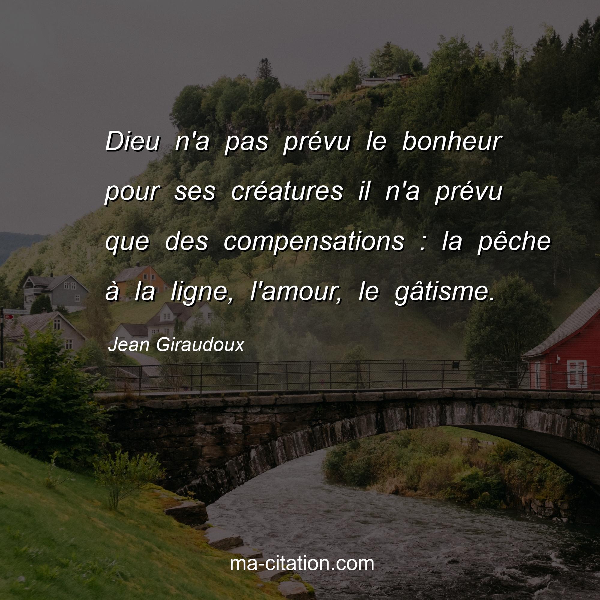 Citation sur la vie de Jean Giraudoux :Dieu n'a pas prévu le bonheur pour ses créatures il n'a prévu que des compensations : la pêche à la ligne, l'amour, le gâtisme.