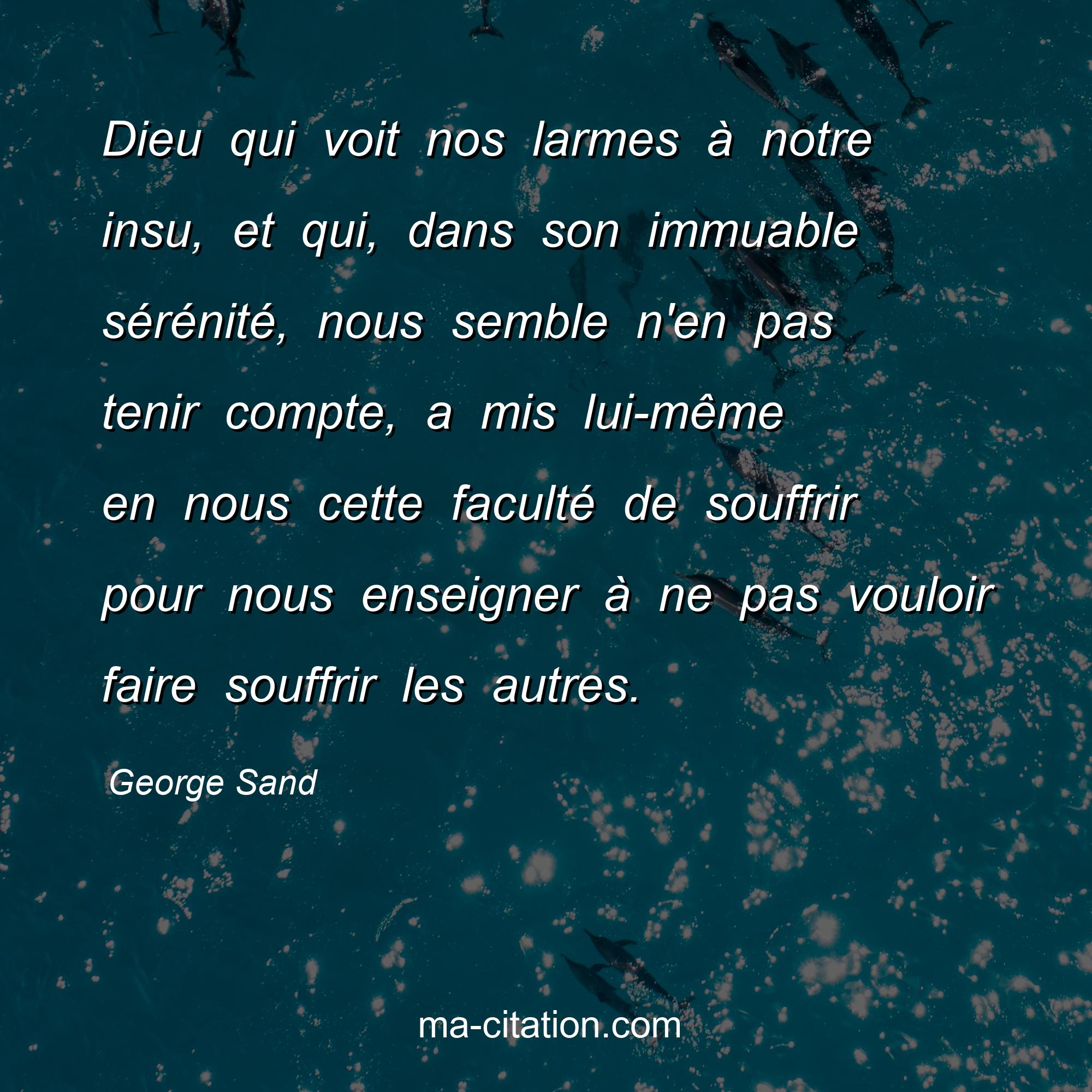 Citation sur la vie de George Sand :Dieu qui voit nos larmes à notre insu, et qui, dans son immuable sérénité, nous semble n'en pas tenir compte, a mis lui-même en nous cette faculté de souffrir pour nous enseigner à ne pas vouloir faire souffrir les autres.