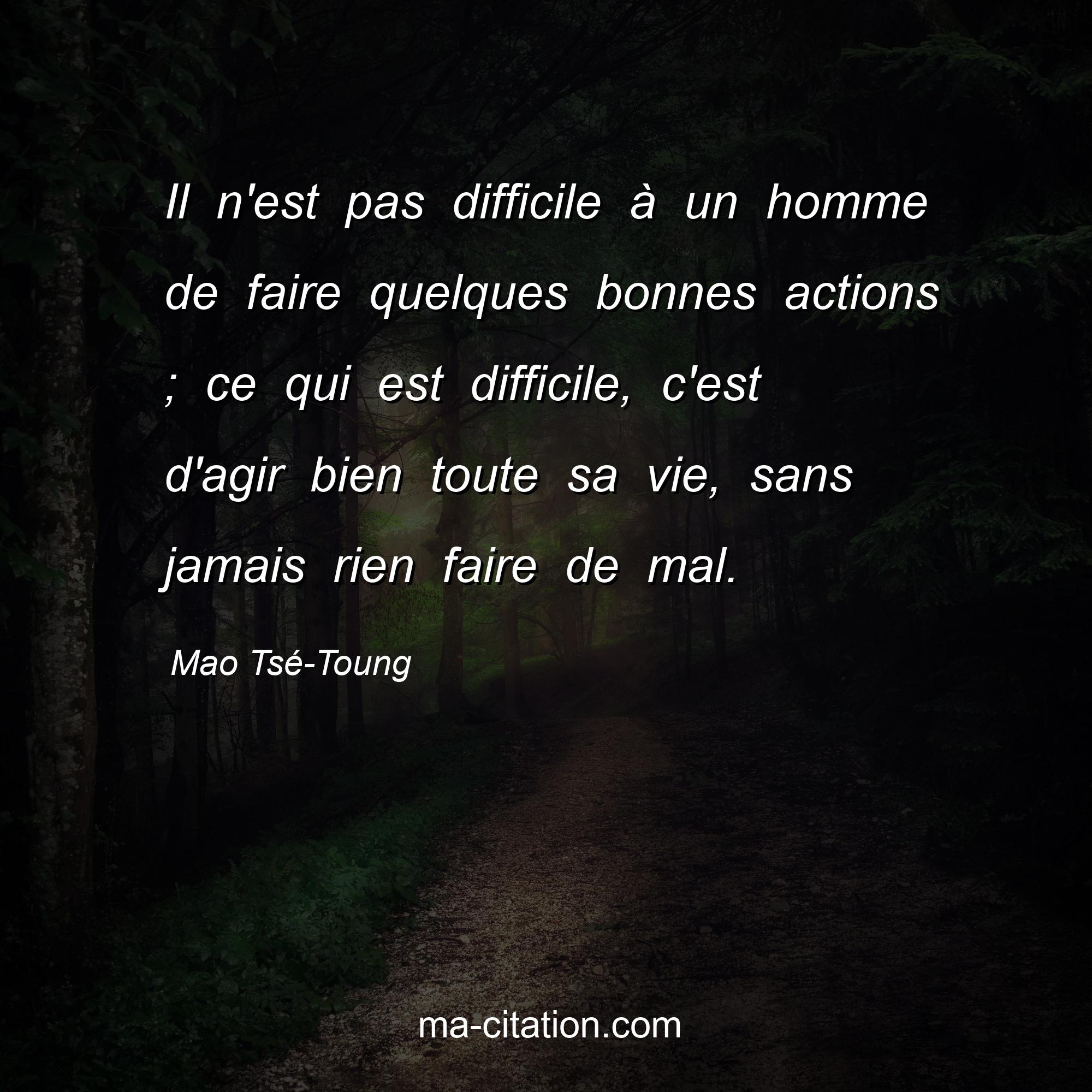 Citation sur la vie de Mao Tsé-Toung :Il n'est pas difficile à un homme de faire quelques bonnes actions ; ce qui est difficile, c'est d'agir bien toute sa vie, sans jamais rien faire de mal.