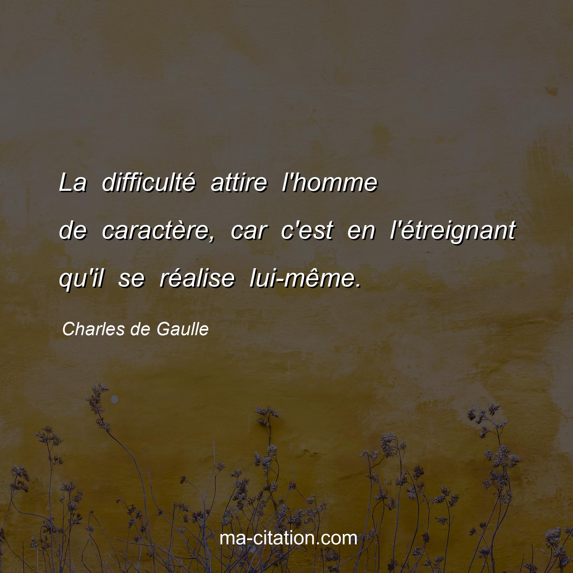 Citation sur la vie de Charles de Gaulle :La difficulté attire l'homme de caractère, car c'est en l'étreignant qu'il se réalise lui-même.